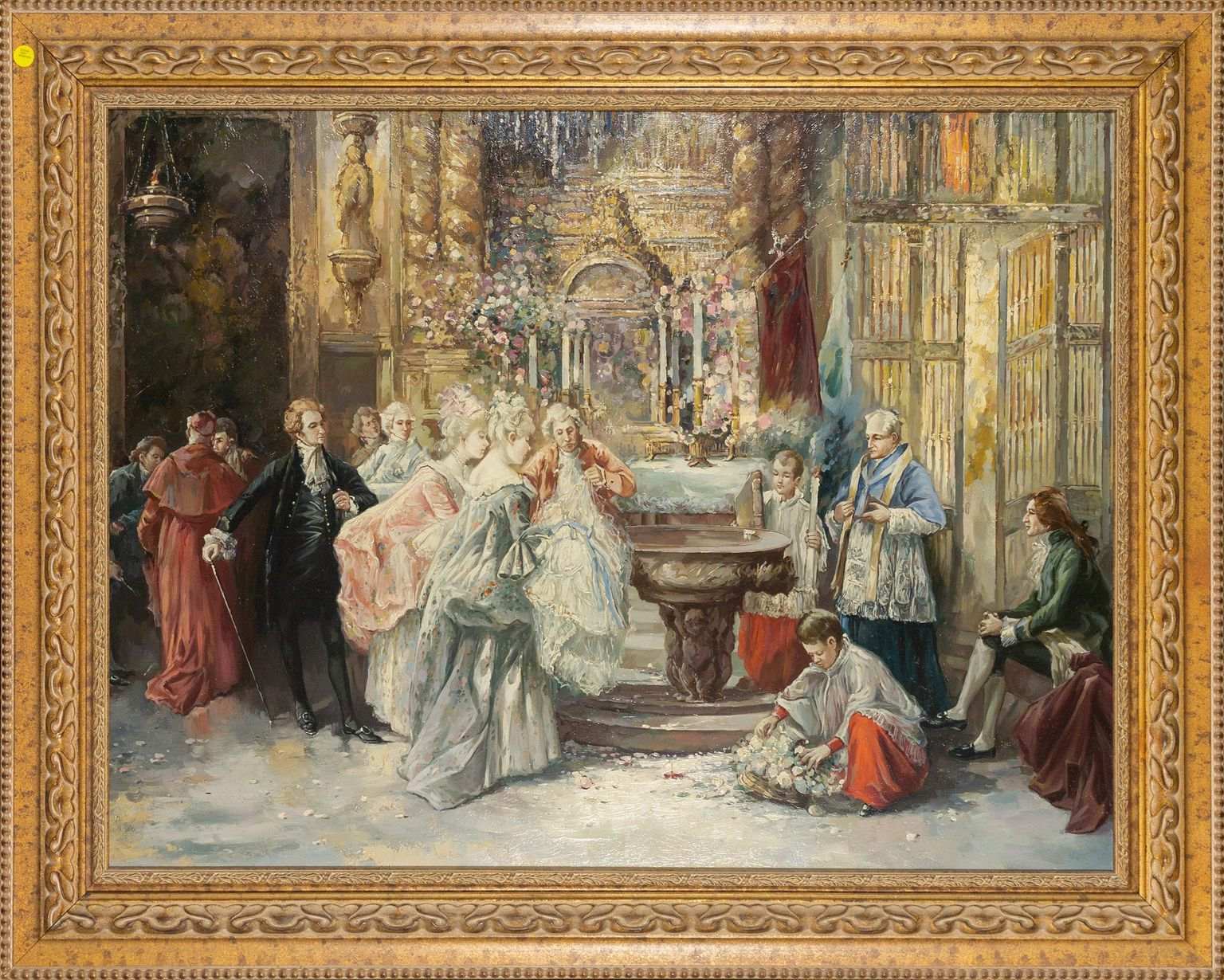 Presenting a captivating antique painting from the 19th century, a Victorian Baptism Scene that portrays a significant religious event. This remarkable artwork, executed in oil on canvas, captures the essence of a Victorian-era baptism ceremony with exquisite detail and profound symbolism. It is housed in a decorative wood frame, enhancing its overall presentation and adding a touch of elegance.Measuring approximately 35-5/8" x 47-5/8" in sight dimensions, this painting transports you to a bygone era, immersing you in the Victorian ambiance and the sacred atmosphere of a baptism scene. The artist's skillful brushwork and attention to detail are evident in every element of the composition, creating a compelling narrative that speaks to the religious fervor and societal customs of the time.