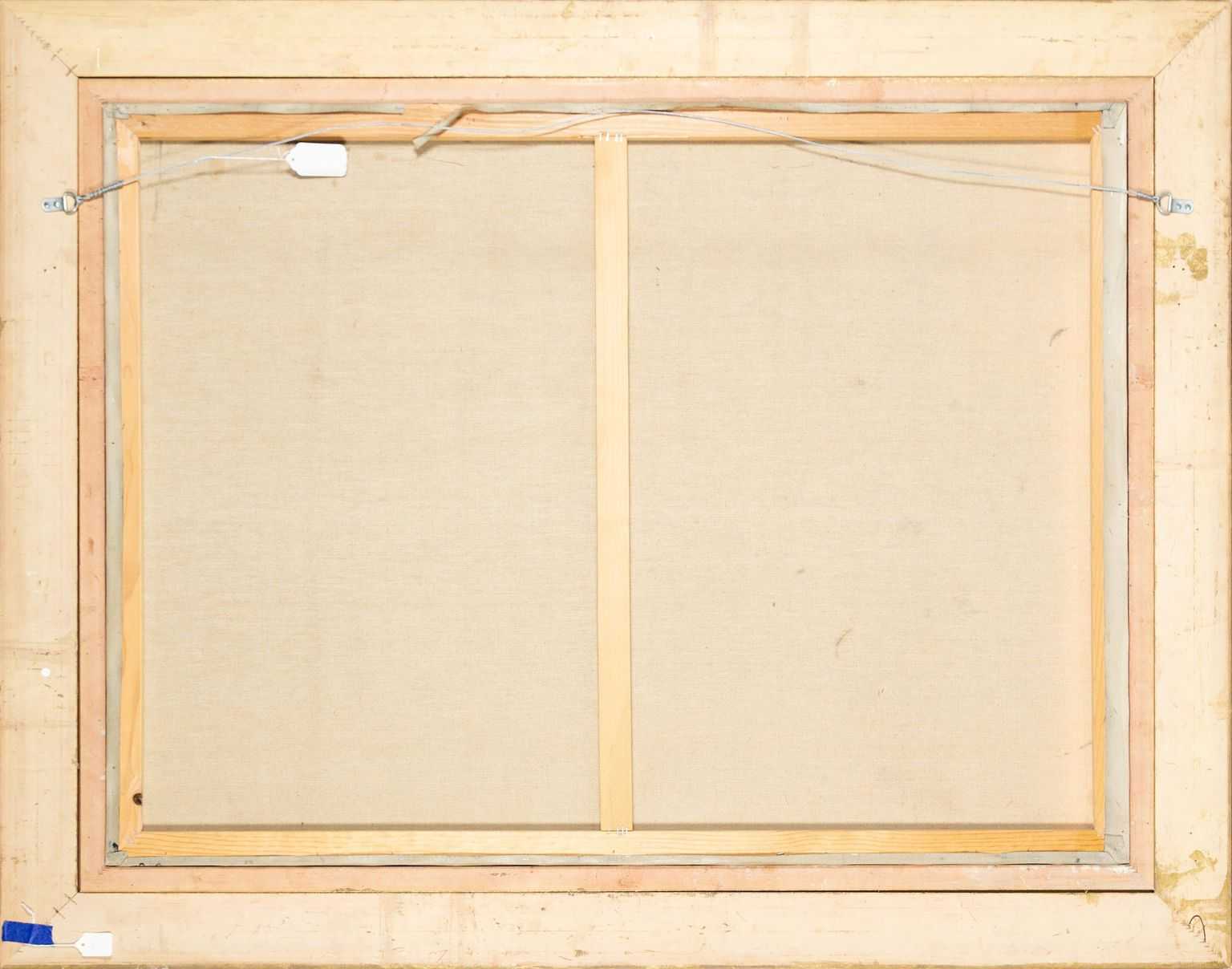 Adorned with a decorative wood frame (46 1/4 x 58 in) , this artwork becomes a focal point in any space it graces. The frame's intricate design and craftsmanship complement the painting's theme, adding a touch of sophistication and grandeur to its overall presentation.