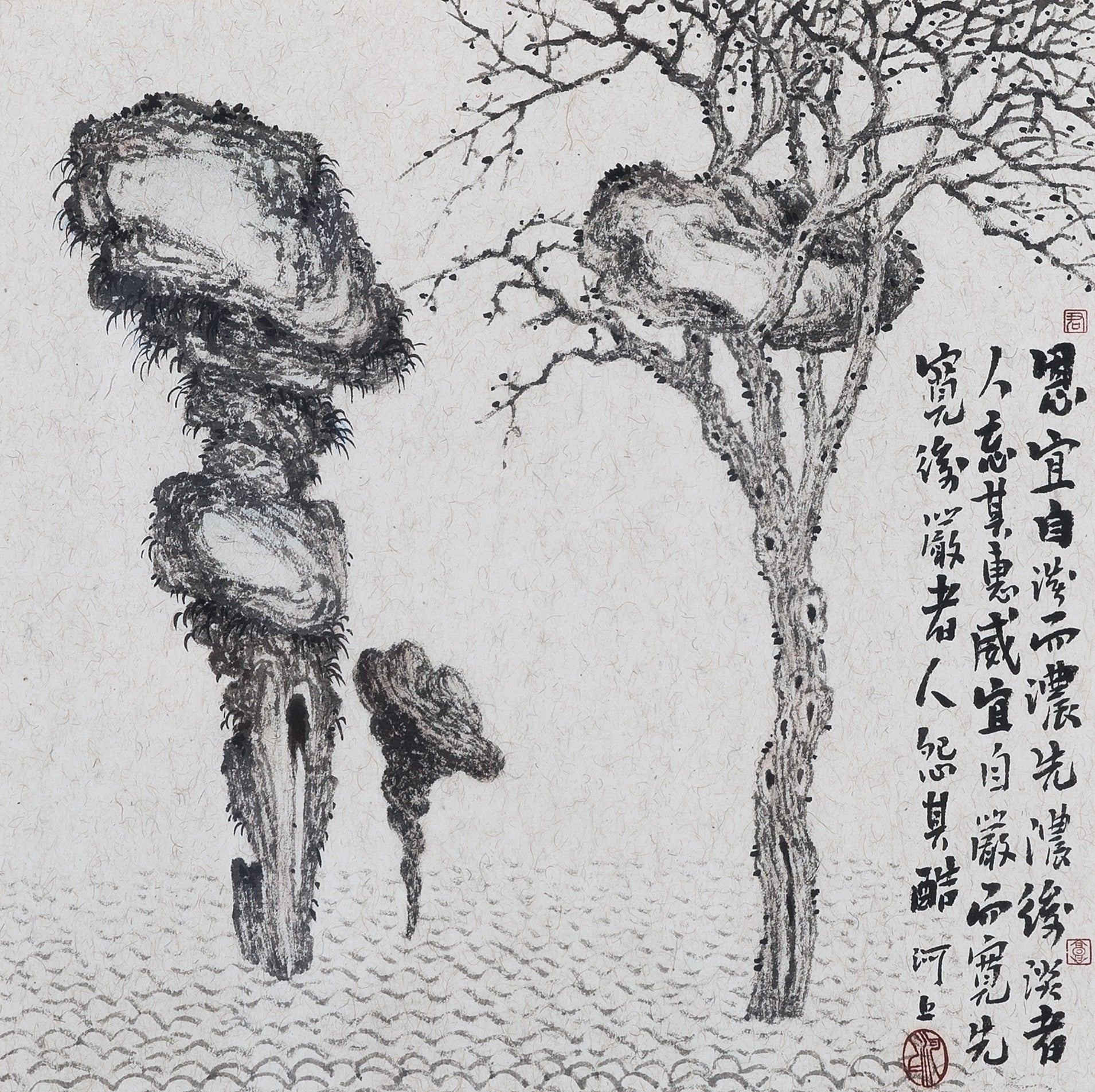 This square-format composition by Huijun Gao exemplifies his refined use of ink and color on paper, featuring intricately rendered scholar's rocks and a gnarled tree rising from a stylized patterned ground. The juxtaposition of solid, textured rock forms and fluid, expressive calligraphy captures a harmonious balance between the natural and the contemplative, offering an evocative meditation on structure, emptiness, and resilience. The presence of calligraphic inscription enhances the aesthetic and philosophical weight of the piece.