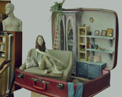 Jing Yang’s work resides at the intersection of sculpture, diorama, and assemblage art. With echoes of Joseph Cornell’s poetic boxes and the emotional storytelling of contemporary figurative installation, Yang fuses nostalgia and surrealism in a tactile form. The hand-modeled figures, often stylized and emotive, are set within carefully constructed micro-environments that blur the line between real and imagined spaces. The use of repurposed materials—such as aged leather suitcases and found furniture—enhances the work’s sense of personal history and timelessness.