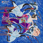 Character 2 is a vivid and stylized Chinese painting measuring 68 x 68 cm (26.77 x 26.77 in), executed in bold ink and color on paper. The composition centers on an elegant female figure adorned in radiant garments of pink, purple, and azure, surrounded by a harmonious flock of red-crowned cranes. Set against a dynamic cobalt blue background, the piece exudes theatricality and lyricism, with the moon rising behind the graceful scene.
