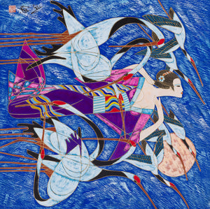This work blends traditional Chinese symbolism with a distinctly modern aesthetic. The exaggerated curves, patterned robes, and flattened perspective evoke influences from Art Deco and Eastern folk art. The stylized treatment of the cranes—with their elongated necks and expressive beaks—resonates with the decorative abstraction often seen in modern Chinese figure painting. Shaoguang's palette and linework also suggest a contemporary feminist voice, using classic motifs to frame themes of beauty, strength, and mythic femininity.