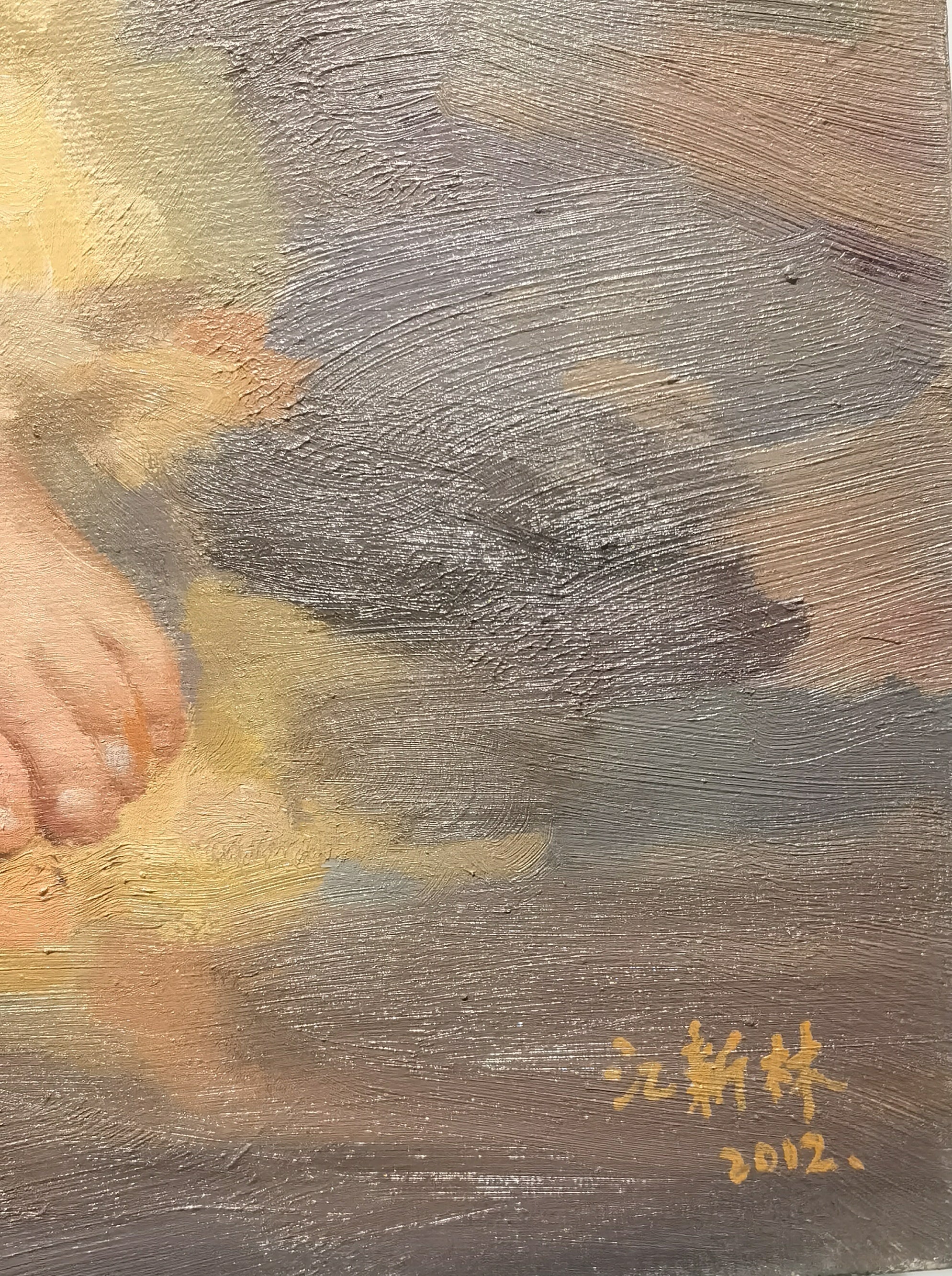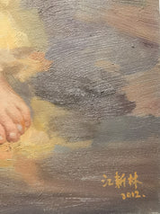 Xinlin Jiang’s distinctive realist style draws from the traditions of Chinese Social Realism while infusing his subjects with a tender, humanistic warmth. His work aligns with the genre painting legacy of Chinese 20th-century academic oil painting, while simultaneously echoing Western figurative approaches in his treatment of light and character. The juxtaposition of detailed portraiture and bucolic landscape reveals an artist deeply invested in storytelling through observation.