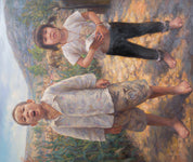 This compelling oil on canvas by Xinlin Jiang, Title:d Calling, portrays two barefoot children standing on a sunlit dirt path in a rural village. Rendered with vivid naturalism and heartfelt expression, the young boy and girl are caught mid-gesture, as if calling out or responding to unseen figures beyond the frame. With a strong sense of immediacy, Jiang captures the rich earth tones of the path, the textural foliage of surrounding maize plants, and the soft light of a rural summer’s day.
