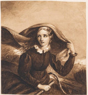 This finely executed 19th-century wash drawing depicts a young lady gracefully draped in a veil, exuding a sense of elegance and quiet introspection. The use of grey and black washes creates a soft, ethereal quality, skillfully emphasizing the delicate features of the subject. Her gaze, directed slightly away, conveys a sense of mystery and contemplation, while the flowing veil adds an element of movement and refinement to the composition. The artist's precise handling of light and shadow showcases a keen understanding of depth and form, reminiscent of the Romantic and Neoclassical portrait traditions.