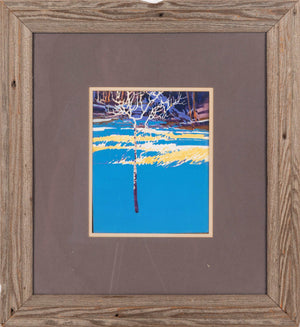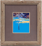 Buffalo Kaplinski: "Lone Aspen & Cerulean Snow""Lone Aspen & Cerulean Snow" by Buffalo Kaplinski is a captivating landscape painting that offers a fresh and slightly abstracted perspective on a view from the Evans Ranch near Evergreen, Colorado. Encased in a rustic weathered pine frame, the artwork captures the serene beauty of nature, emphasizing the interplay of blue and yellow complementary contrast, a powerful visual technique.