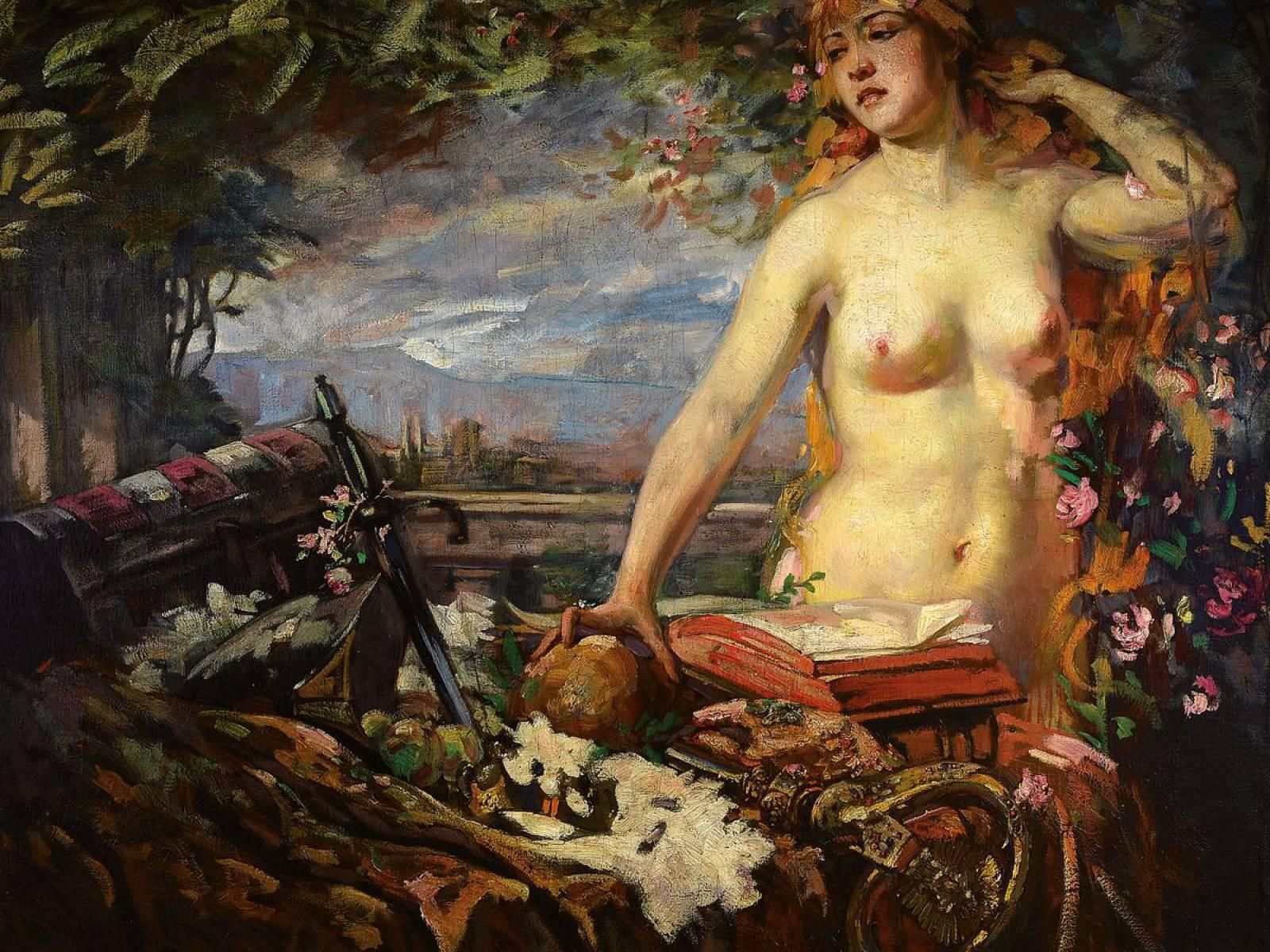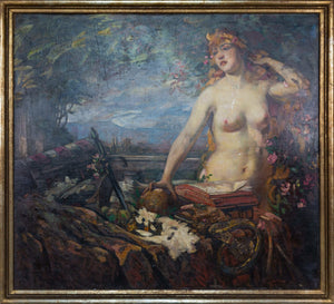 Title: Female Half-Nude with Still Life on a BalconyMedium: Oil on Canvas