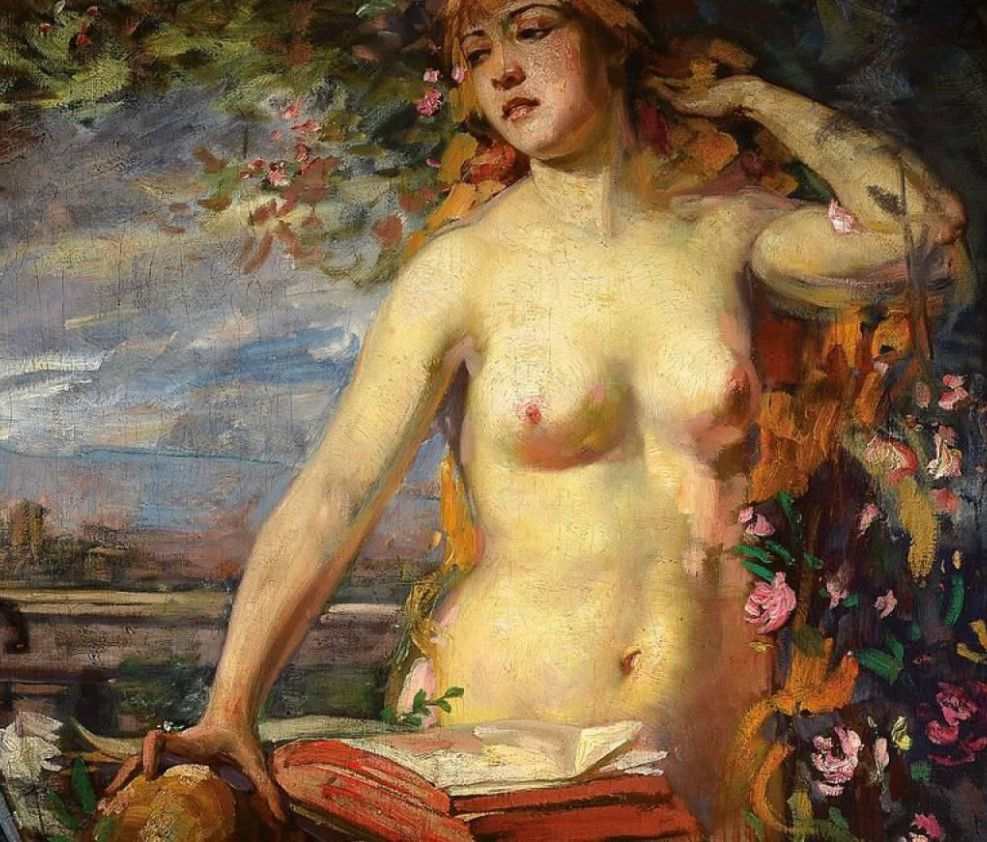 The painting portrays a captivating female half-nude figure set against the backdrop of a bustling city. The juxtaposition of the figure and the still life on the balcony creates a sense of contrast and balance, inviting you to explore the connections between the different elements of the composition.