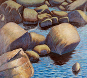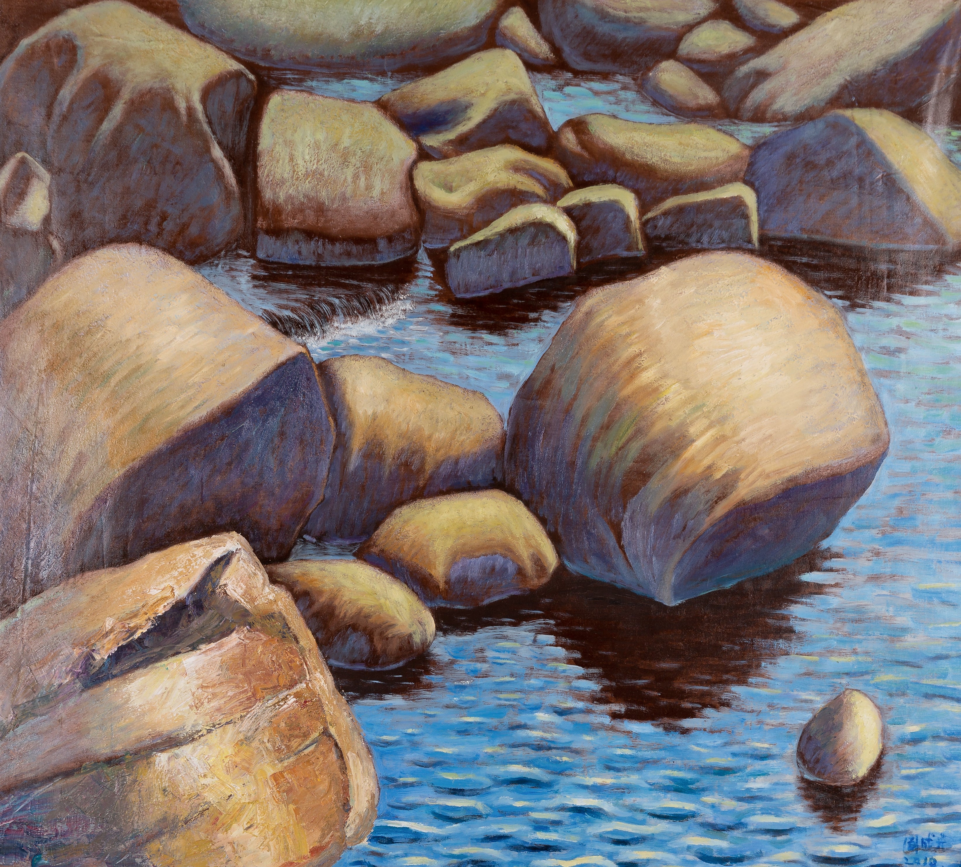 Executed during a period of heightened interest in ecological and cultural themes in Chinese art, this work reflects a dialogue between heritage and modernity. The monumental rocks evoke endurance and permanence, while the shimmering water suggests impermanence and flux—an enduring philosophical duality in Chinese aesthetics. Chengguang Zhou, a respected educator and award-winning painter, channels these concepts into a contemporary visual language that resonates globally.