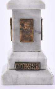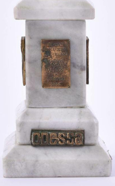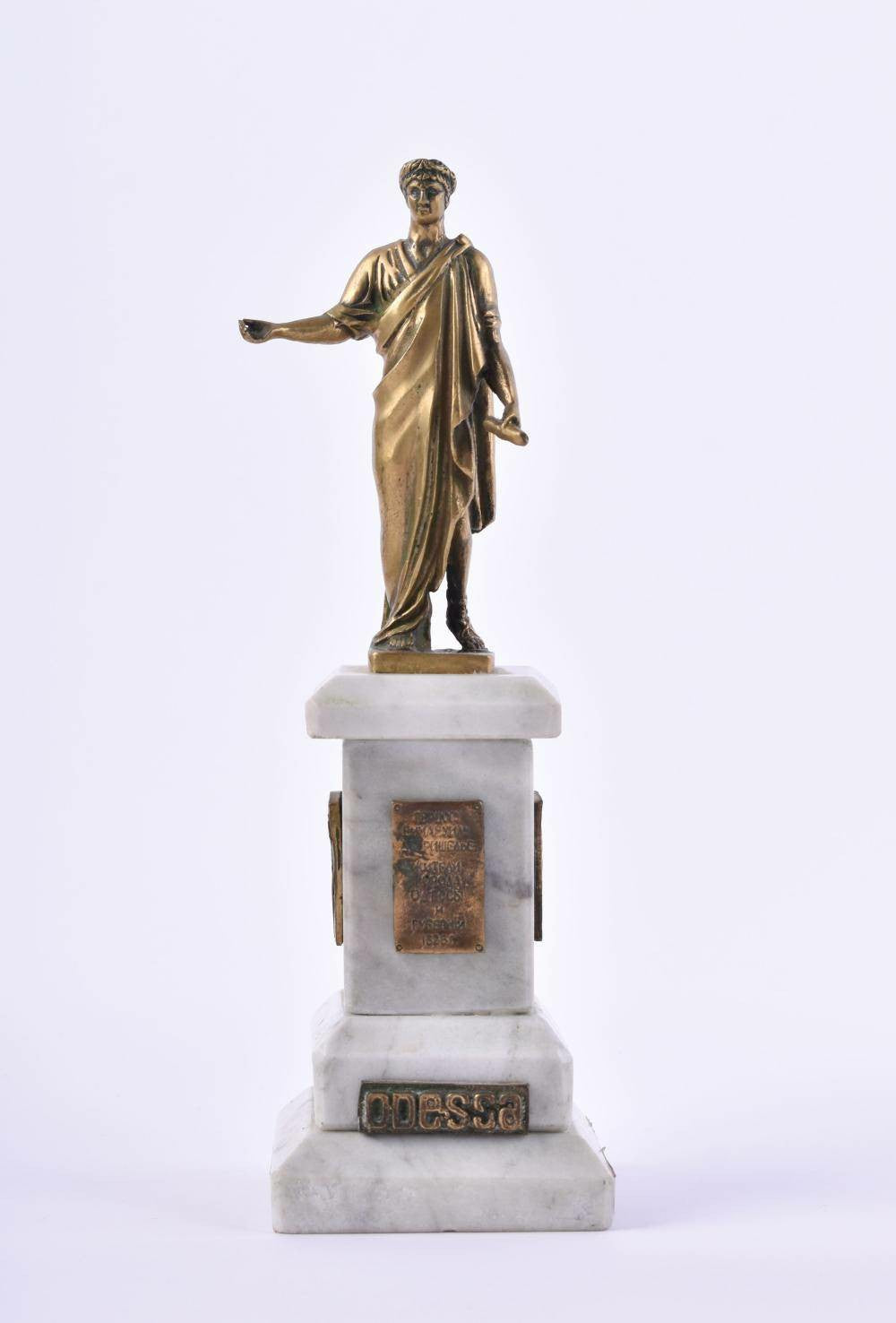 The "Odessa" sculpture is a finely crafted bronze piece mounted on an elegant marble base, standing at a total height of 20.5 cm. This exquisite artwork showcases detailed craftsmanship, embodying a timeless aesthetic. The bronze and marble materials provide durability and a classic visual appeal, making it a valuable addition to any art collection or decor.