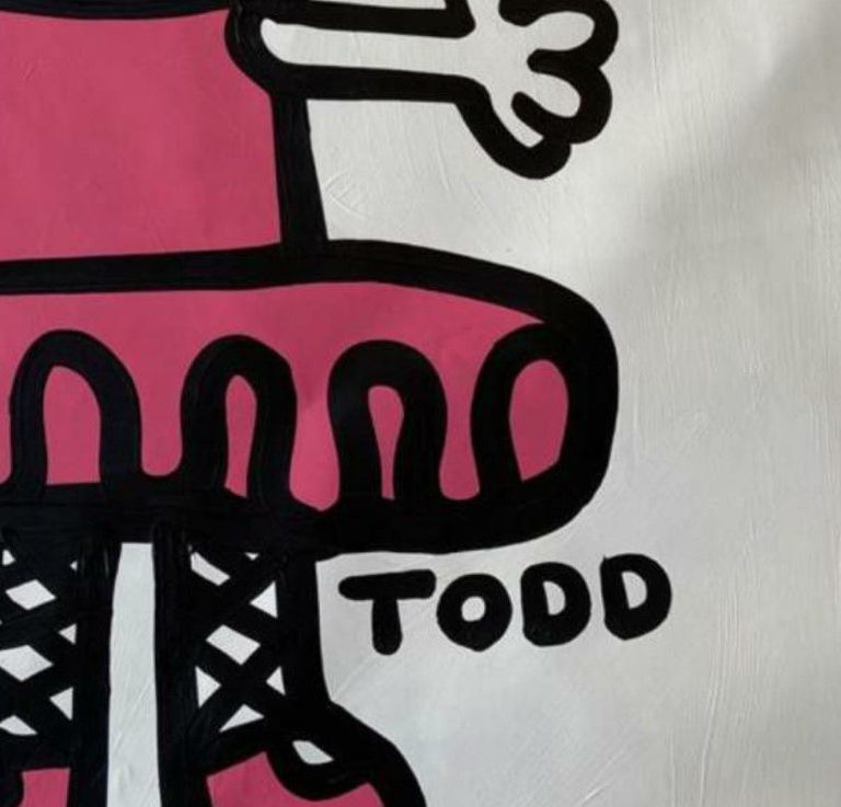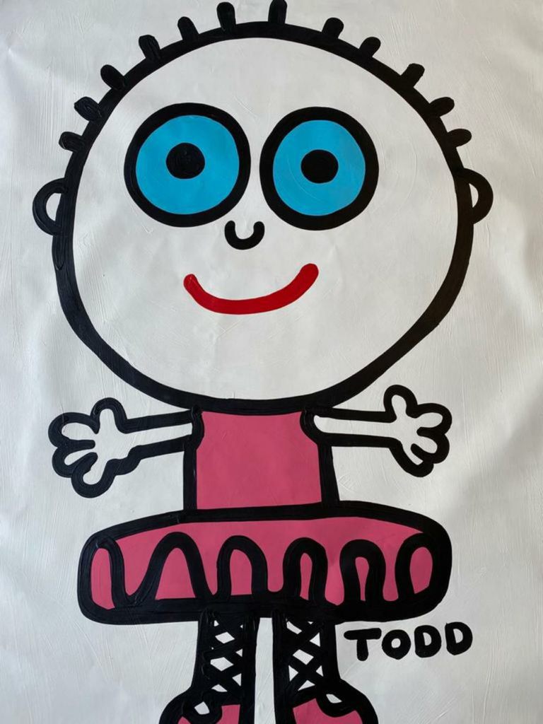 "Boys Can't Dance" is a playful artwork by Todd Goldman that features a figure dressed in ballerina attire. Goldman's distinctive style is characterized by a cartoon-like approach, featuring bold, dark contours and stylized, flat shapes. In this piece, the figure is depicted wearing pink garments that stand out against the clean, white background.