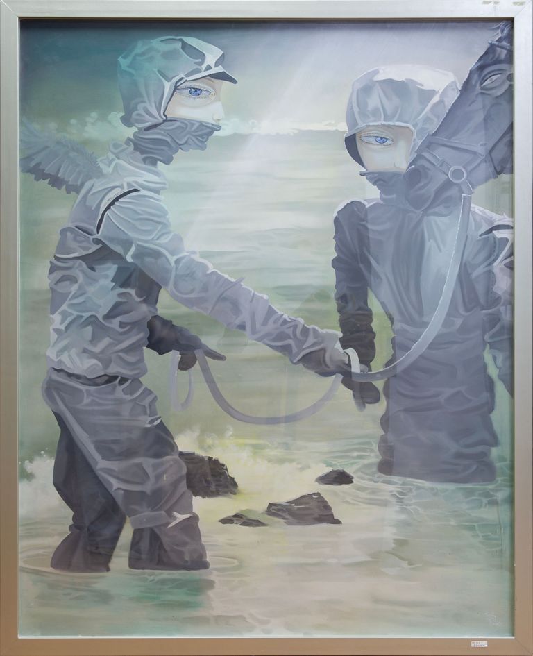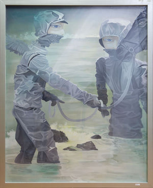 Transparent Beach is a compelling oil on canvas by Yu Xiong, measuring 150 by 120 centimeters. The composition showcases his distinctive blend of classical painting techniques infused with contemporary pop culture elements. Featuring surreal, ethereal figures and vivid, dreamlike colors, the work embodies a unique visual language that navigates between reality and imagination, evoking a poetic sense of the virtual and symbolic.