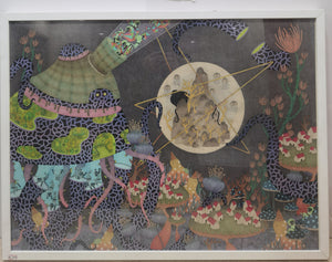 This Untitled print from 2014 by the Taiwanese duo LIN Yu-Ching and WEI Hsin-Yu is an intricate visual symphony that intertwines surreal natural forms, cosmic symbolism, and richly patterned textures. Dominated by an enigmatic central orb—within which mountain-like shapes and translucent jellyfish-like beings float—this piece seems to map an astral convergence between mythical realms and ecological fantasy.