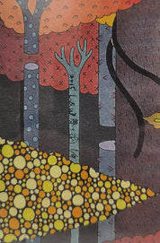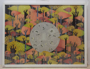 This Untitled 2015 print by the Taiwanese artist duo LIN Yu-Ching and WEI Hsin-Yu presents a stylized forest landscape where a prominent gray circular form overlays a vibrant, densely packed field of treetops. Rendered in meticulous textures and saturated autumnal tones—rust red, mustard yellow, moss green—the forest evokes both a whimsical and meditative quality. The sphere at the center, filled with sinuous linework and tiny motifs, suggests an alternate realm or hidden inner world embedded within the outer environment.