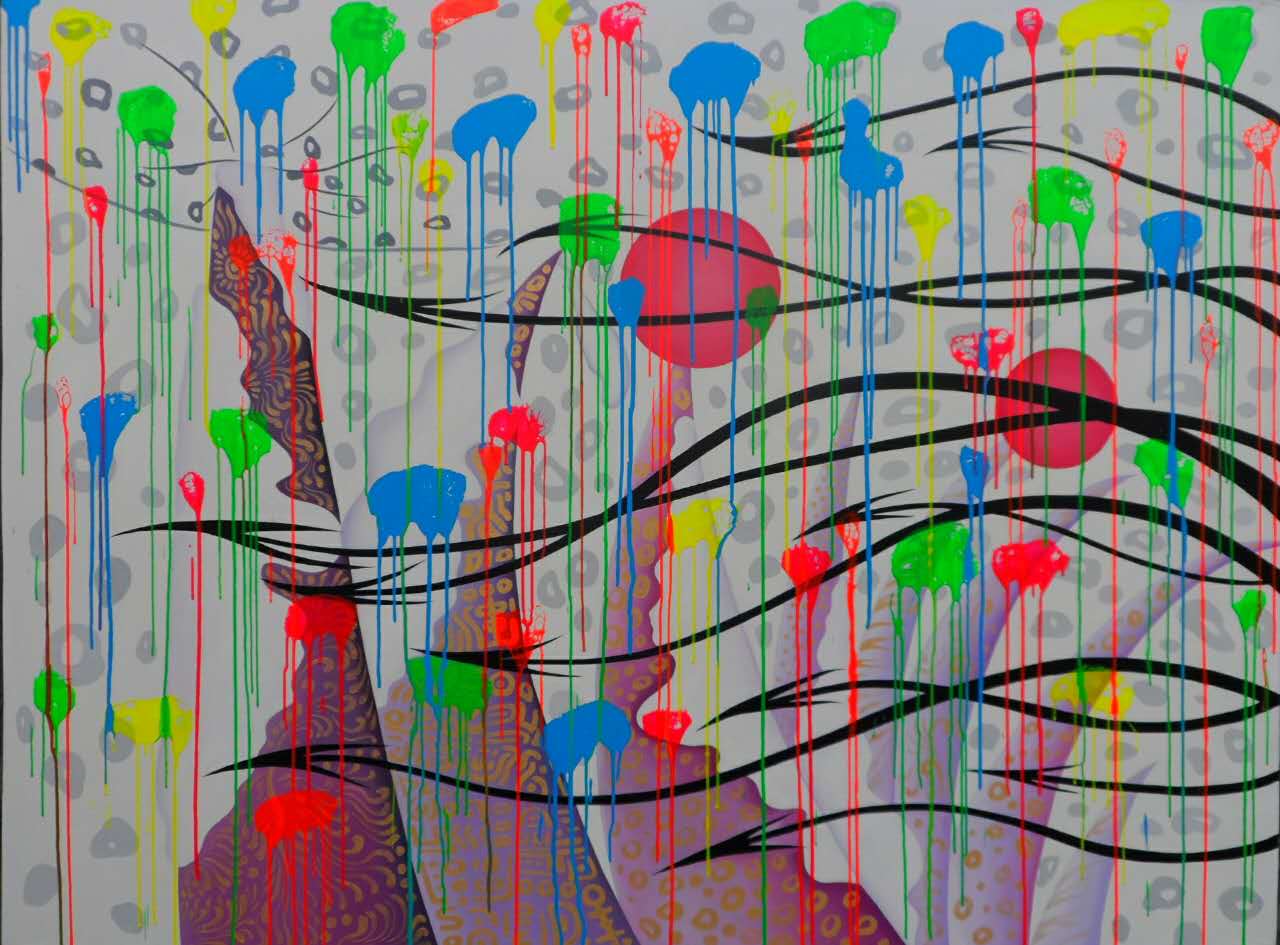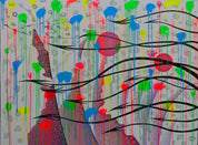 Bible Reading Moments (2012) is a visually complex and energetically layered oil on canvas by Zhan Yang. The work features a symphonic interplay of visual motifs: dripping neon pigments in lime green, crimson, cobalt blue, and yellow cascade across a backdrop of meticulously rendered patterns and sharp black wave-like lines. Abstract red circles, suggestive of celestial or symbolic forms, float in the composition, which is framed by pointed organic shapes and soft grey ovals. The result is a vivid and kaleidoscopic meditation on rhythm, spirituality, and the tension between order and chaos.