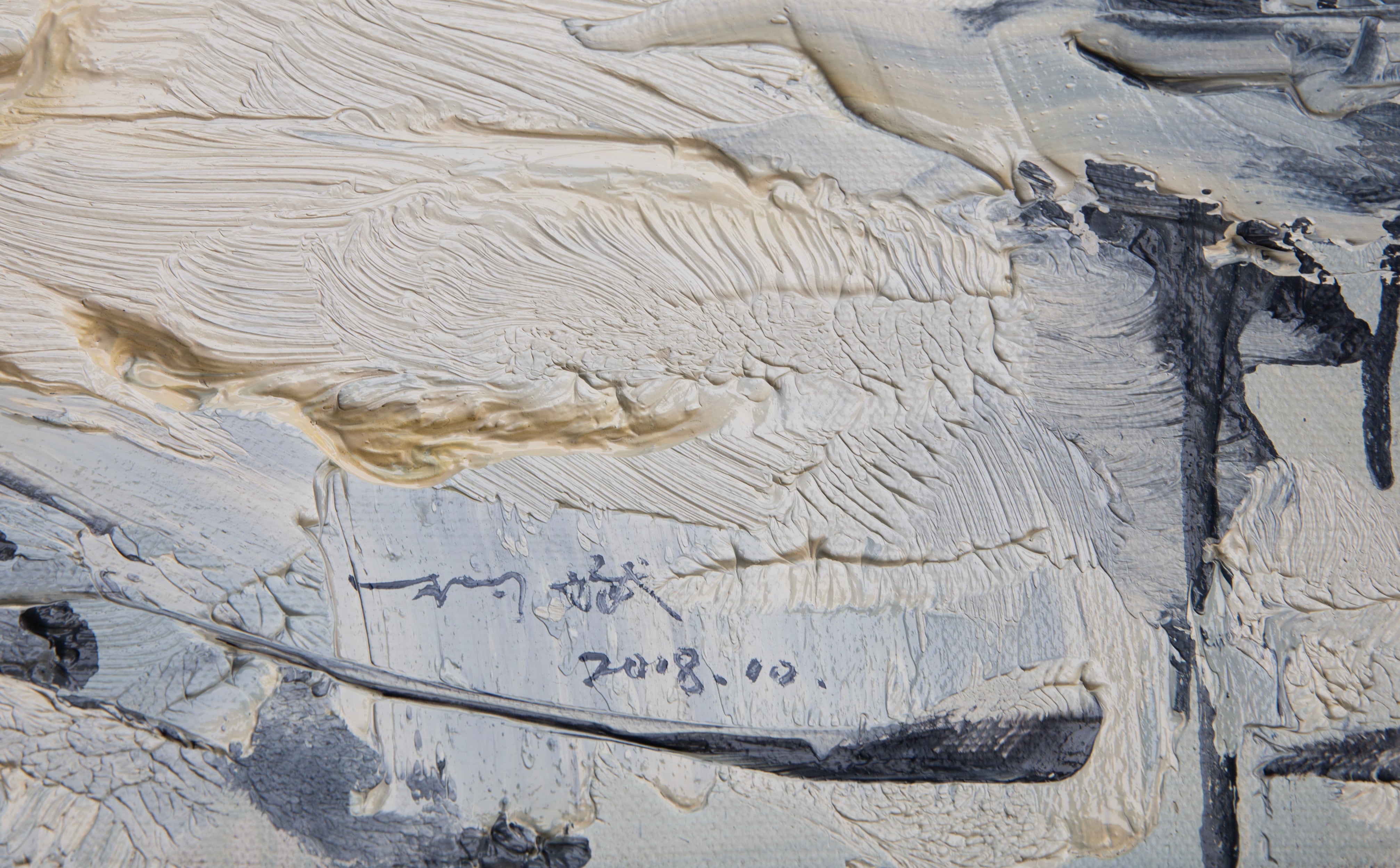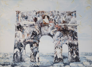 A monumental canvas over three meters wide, Triumphal depicts an ethereal arch rising from an icy, indeterminate seascape. At close range the structure resolves into dozens of loosely impastoed vignettes—cavalry charges, imperial audiences, and battlefield farewells—quoting canonical European history paintings of the Napoleonic era. Shen Shubin’s characteristic palette-knife strokes leave passages of raw linen exposed, allowing light to flicker between figuration and abstraction.