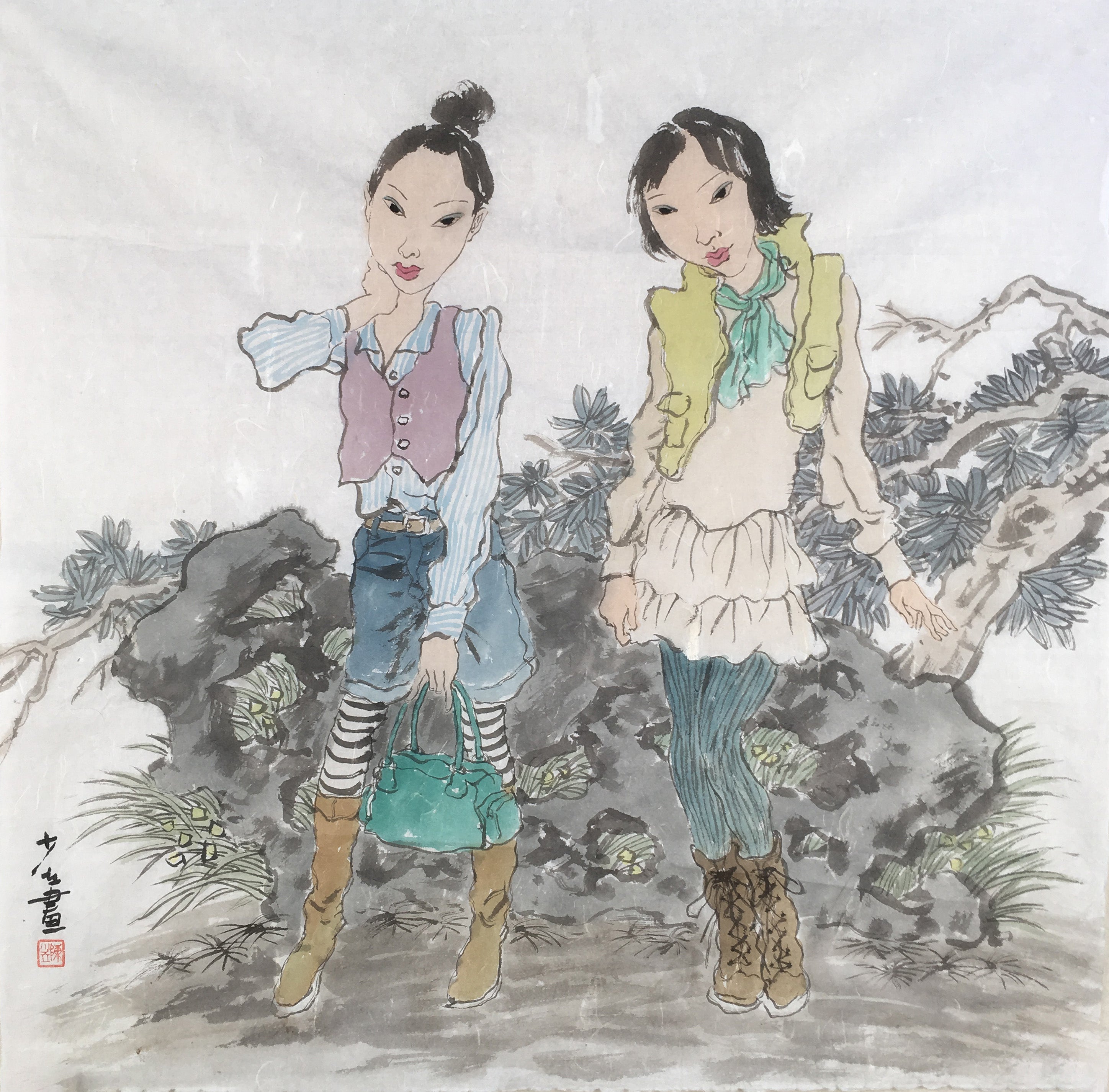 In Twins, Shaoli Chen presents two young women striking confident poses against a textured natural backdrop. Though not necessarily biological twins, the figures share a visual harmony in style and posture that suggests a symbolic or emotional twinning—perhaps evoking friendship, sisterhood, or mirroring identities. Their fashion-forward outfits, striped tights, and pastel layers bring a distinctly modern flair to a composition rooted in traditional brushwork.