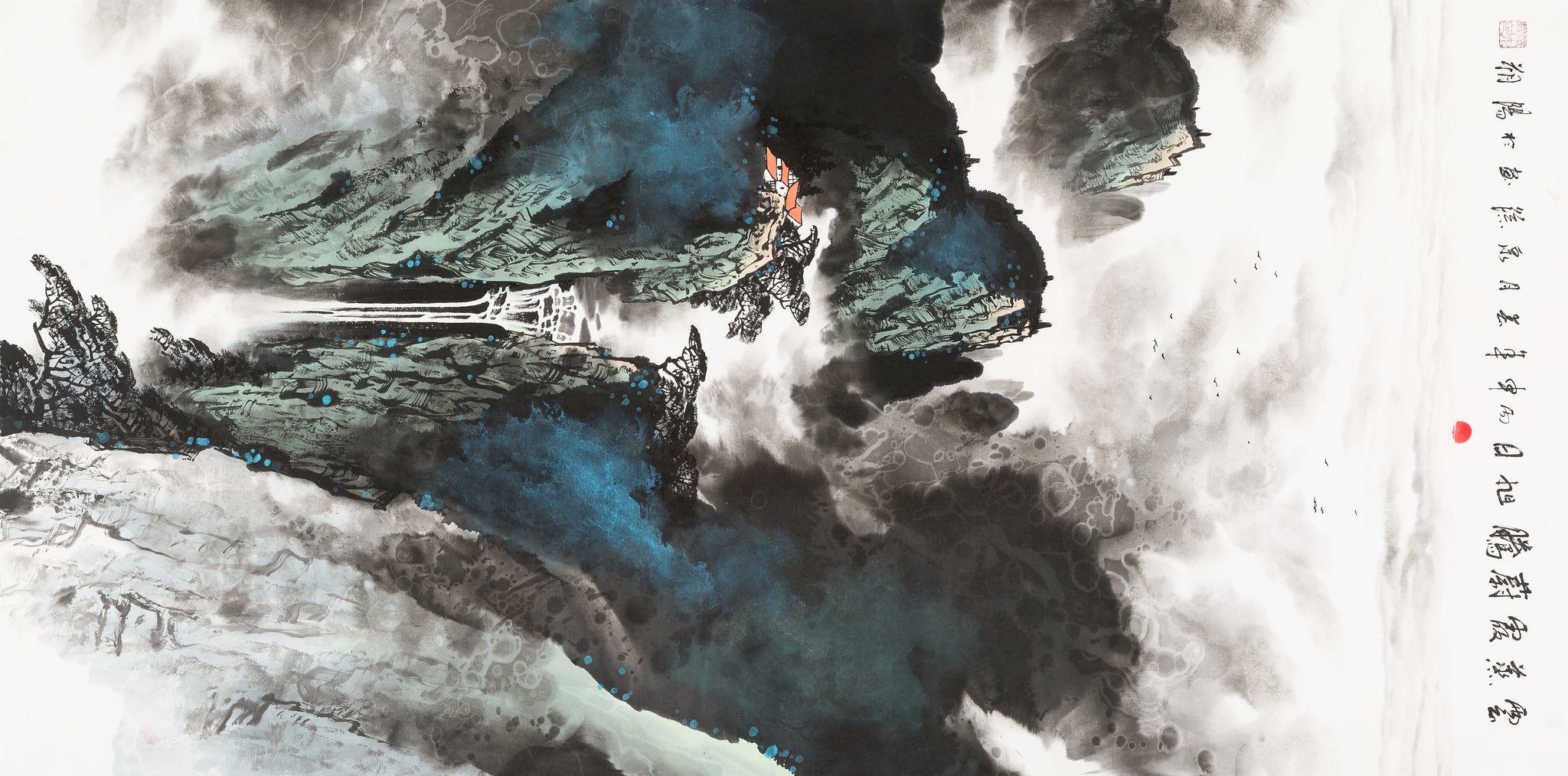 The Title: references Xianyu and Weiteng, evoking mythical or poetic landscapes within the Chinese imagination—possibly connoting immortal realms or spiritually elevated places. “Clouds steaming” and the motif of a rising sun are deeply symbolic: mist represents transformation and mystery, while the morning sun suggests awakening, rebirth, and harmony between cosmic and earthly forces. This reverence for natural order, steeped in Daoist and Confucian ideals, has been a central theme in Chinese landscape painting for over a millennium. Zhang continues this lineage with quiet power and thoughtful innovation.