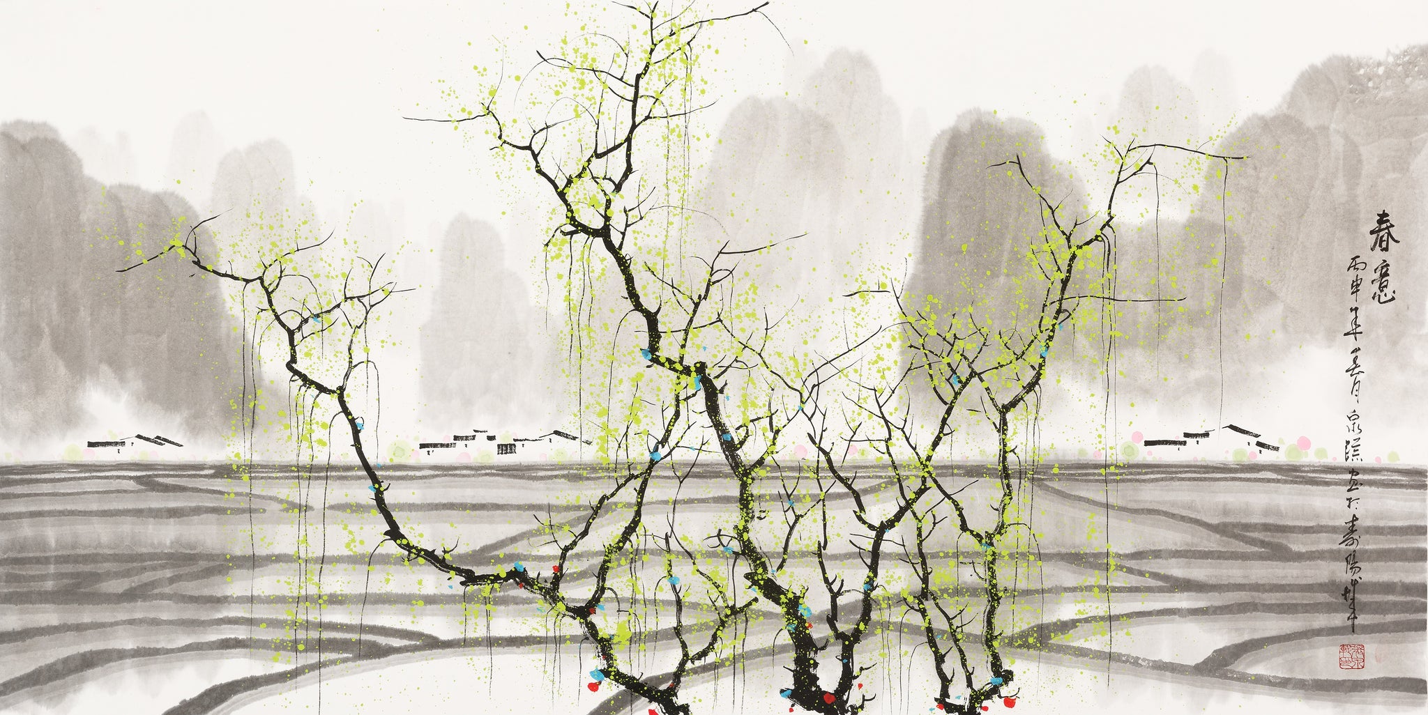 Quanzong Zhang’s Spring reflects the enduring influence of the literati painting tradition, which emphasizes expressive brushwork and poetic naturalism over strict realism. The piece exhibits hallmarks of Chinese landscape painting (shan shui), employing a harmonious palette and layered brush techniques that suggest depth and vitality. The restrained yet evocative use of color aligns with the aesthetic principles of Ming and Qing dynasty masters, while Zhang’s contemporary sensibility infuses the work with fresh immediacy.