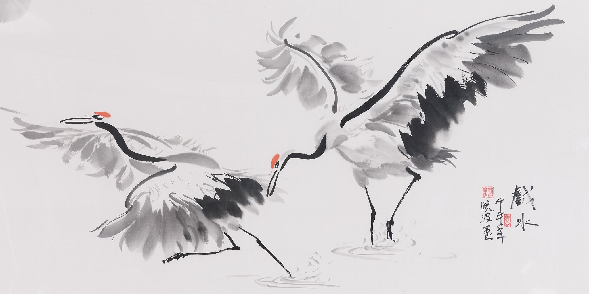 In Splashing, Xiaobo Lu captures a vivid and dynamic moment between two cranes, one seemingly chasing the other in a flurry of movement. Painted in traditional Chinese ink on paper, the elongated scroll format allows the artist to create an immersive and cinematic narrative. The motion of the birds, set against a sparse background, is emphasized by swift brushwork and masterful use of empty space, imparting both vitality and elegance.