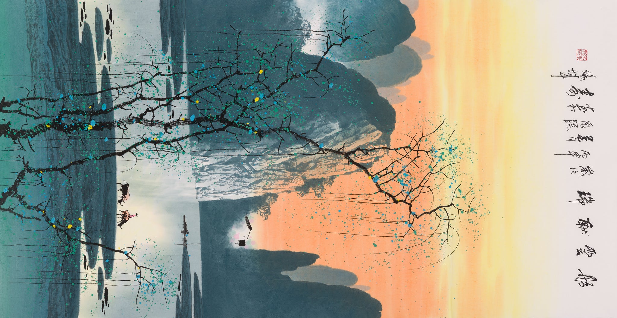 Zhang draws upon the classical shan shui tradition, echoing techniques developed in the Song and Yuan dynasties while embracing a more fluid and romantic interpretation of space and light. His style often emphasizes atmospheric depth and poetic suggestion rather than strict topographical accuracy. The glowing clouds serve as a dynamic visual motif, lending a sense of transcendence and serenity to the landscape—hallmarks of Zhang’s visual language.