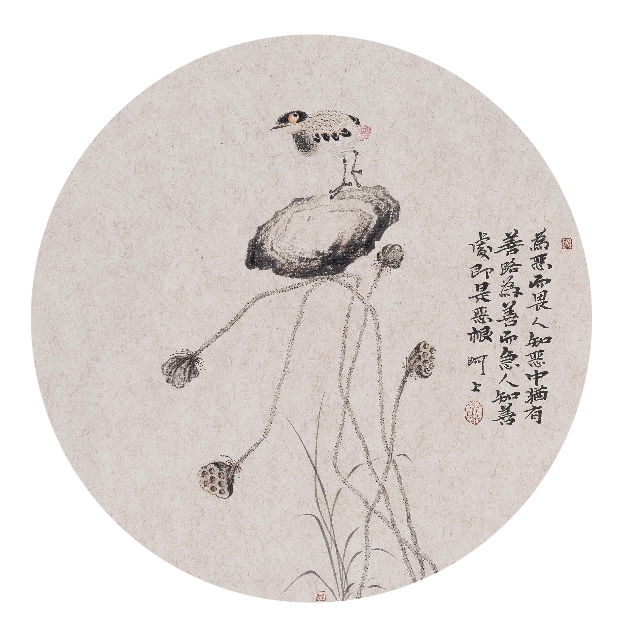 This circular ink and color painting by Huijun Gao presents a delicate and symbolically rich composition. Perched atop a weathered rock, a solitary bird surveys its surroundings, framed by curling lotus stems and pods rendered with lyrical fluidity. Executed on a pale, textured ground, the work integrates subtle tonal variation with traditional brush techniques. A vertical calligraphic inscription on the right side balances the image both visually and conceptually, reinforcing the literati ethos central to Gao’s practice.