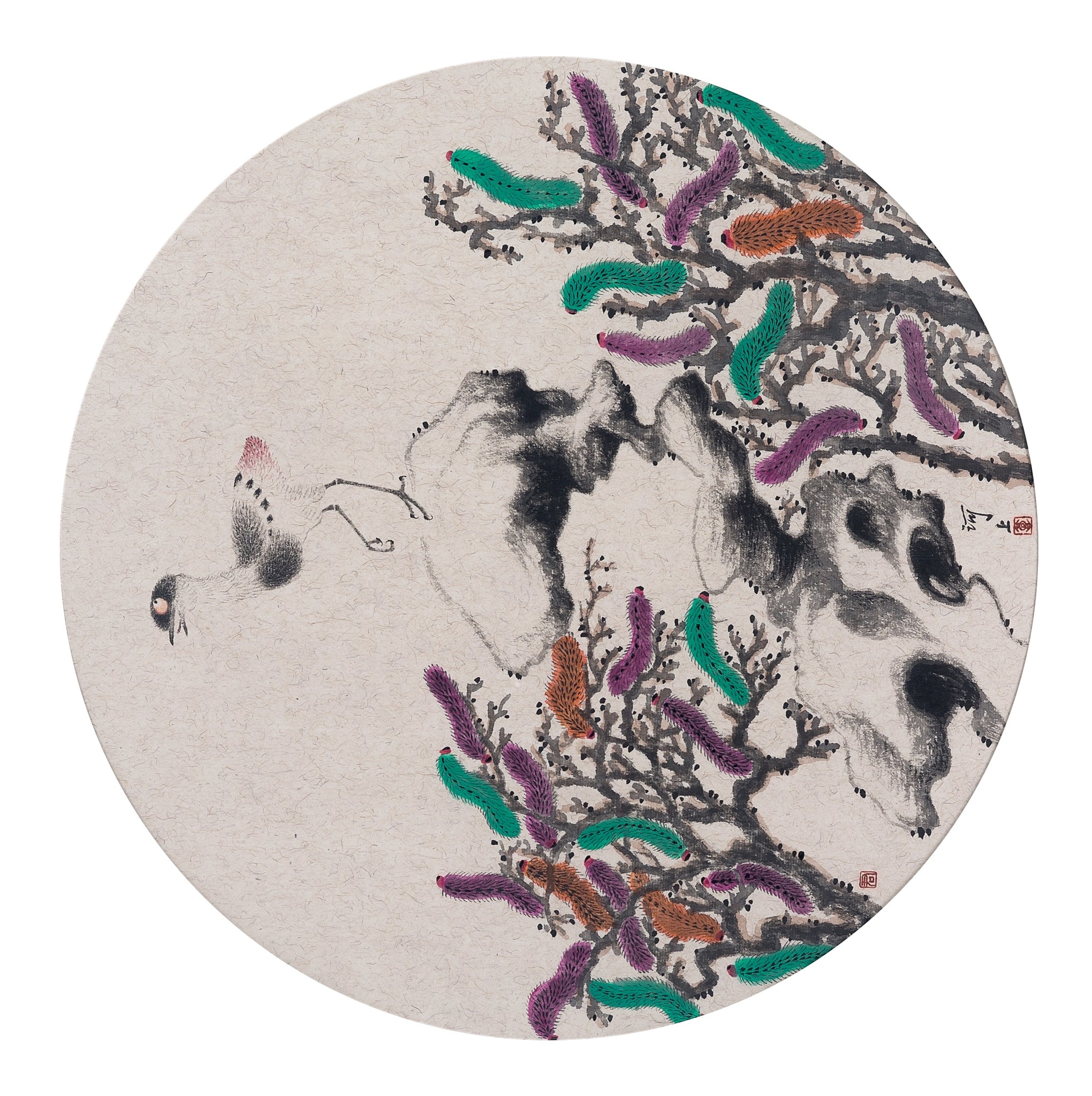 This vividly imaginative circular painting by Huijun Gao features a dynamic interplay between natural and fantastical elements. A single bird, rendered with elegant precision, appears to be mid-motion, perched precariously on jagged scholar's rocks. Around it, bursts of colorful foliage—rendered in striking purples, greens, and oranges—emanate from twisted branches, creating a lush, dreamlike environment. The unusual chromatic accents depart from the traditional Chinese ink palette, revealing Gao’s willingness to innovate within a classical framework.