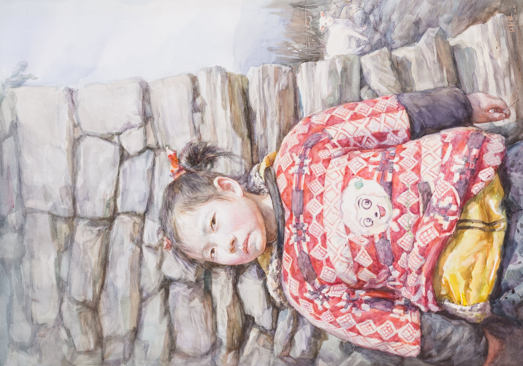 To Find is a poignant watercolor by Xinlin Jiang, rendered on paper and measuring 76 x 53 cm. The composition centers on a young girl in a vibrant red patterned jacket, standing stoically against a rough stone wall. Her wary expression and defensive posture are captured with psychological precision. A small goat in the distance subtly echoes themes of innocence and rural life.