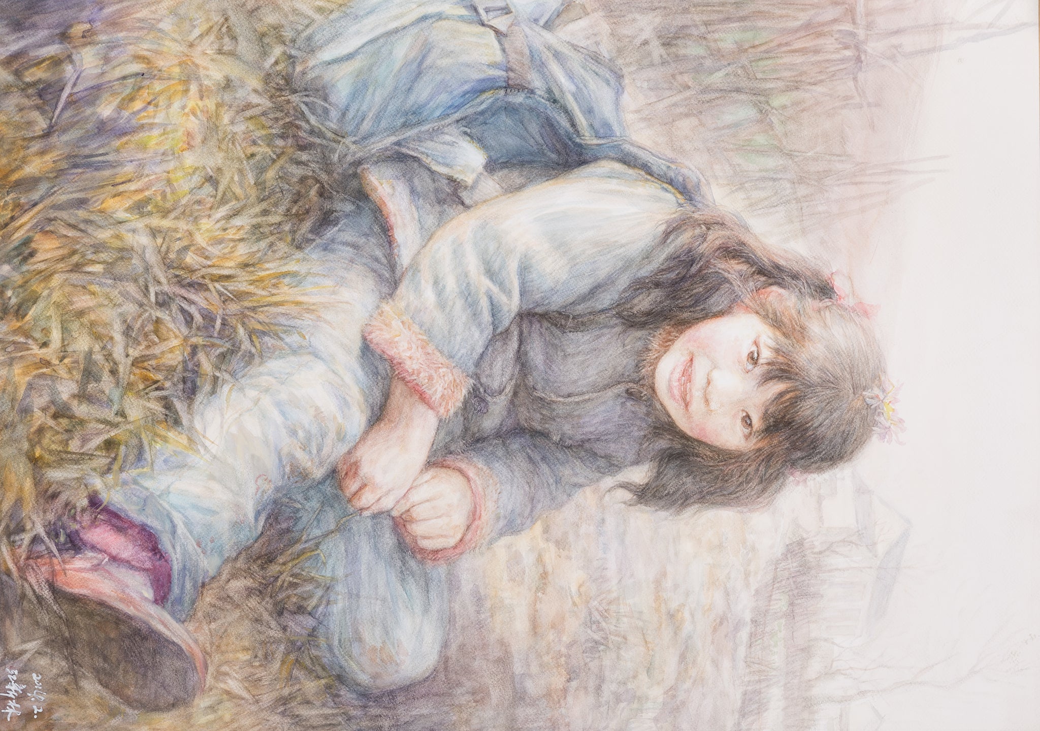 “Spring Comes” is a captivating watercolor portrait by Xinlin Jiang, a contemporary Chinese artist celebrated for his sensitive depictions of rural life. In this tender composition, a young girl is shown sitting in the grass at the edge of a village path, her joyful expression rendered with subtle washes of watercolor. Her winter coat, still flecked with seasonal chill, hints at the transitional arrival of spring.