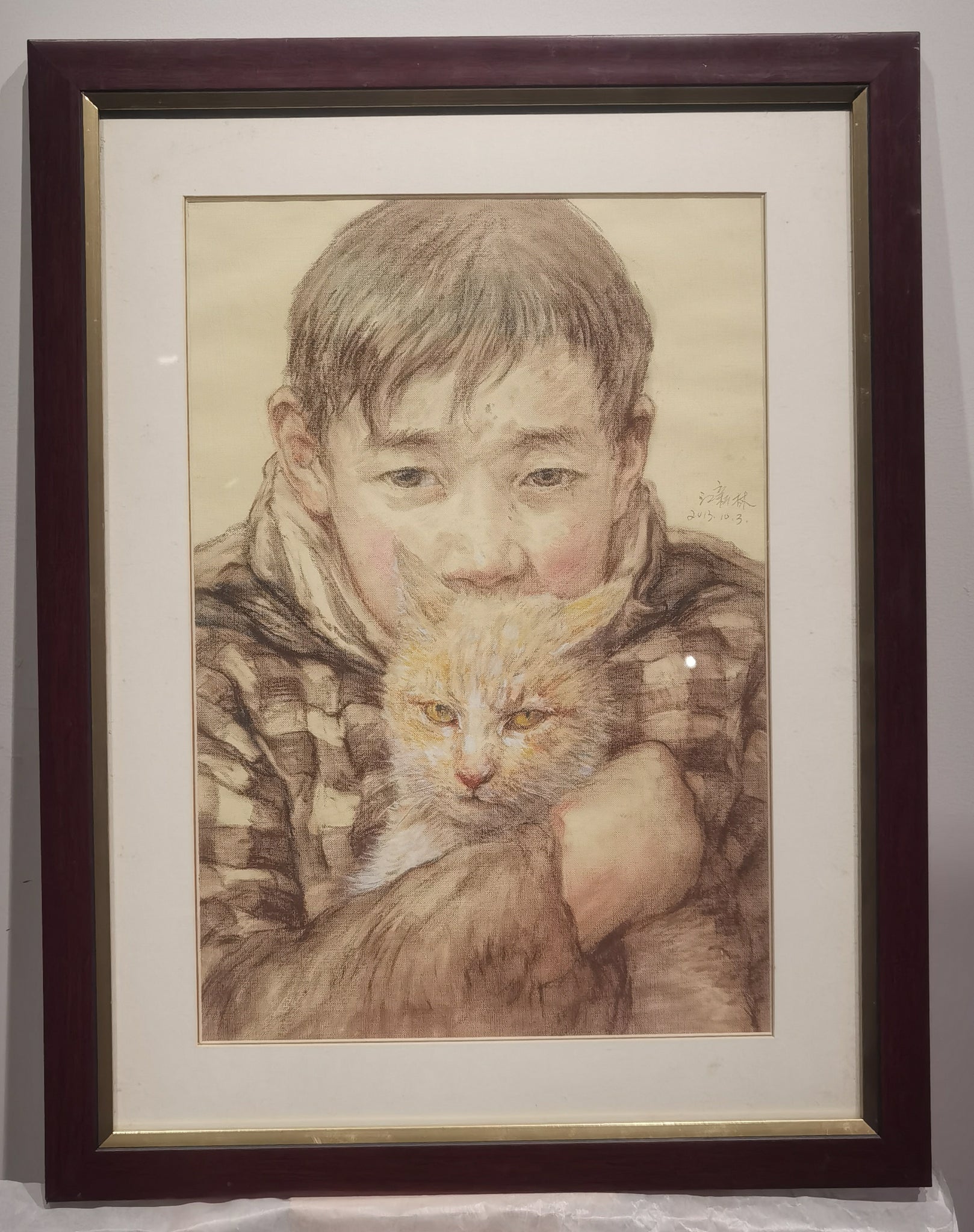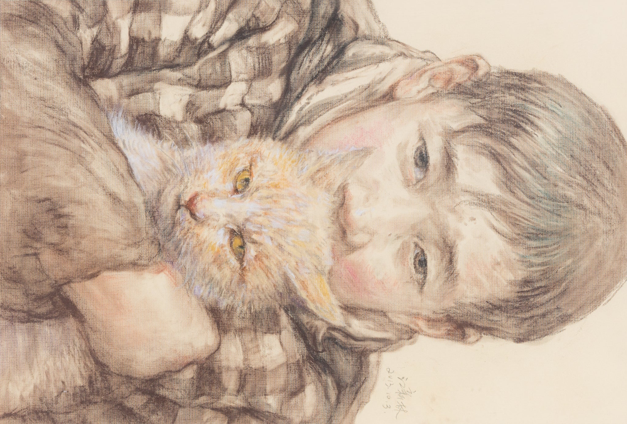 “With” is an intimate and expressive drawing by Chinese artist Xinlin Jiang. The work depicts a boy in a plaid coat gently holding a ginger cat close to his chest. The delicately rendered forms convey a quiet emotional depth, capturing a tender moment of companionship between child and animal. The piece is signed and dated by the artist.