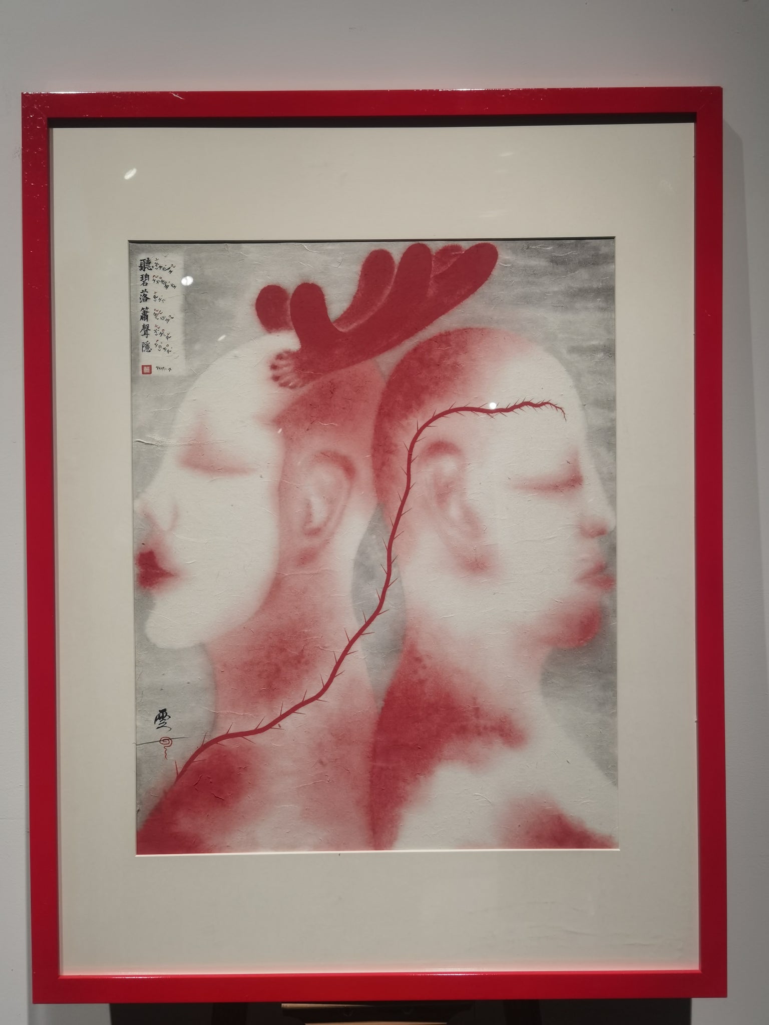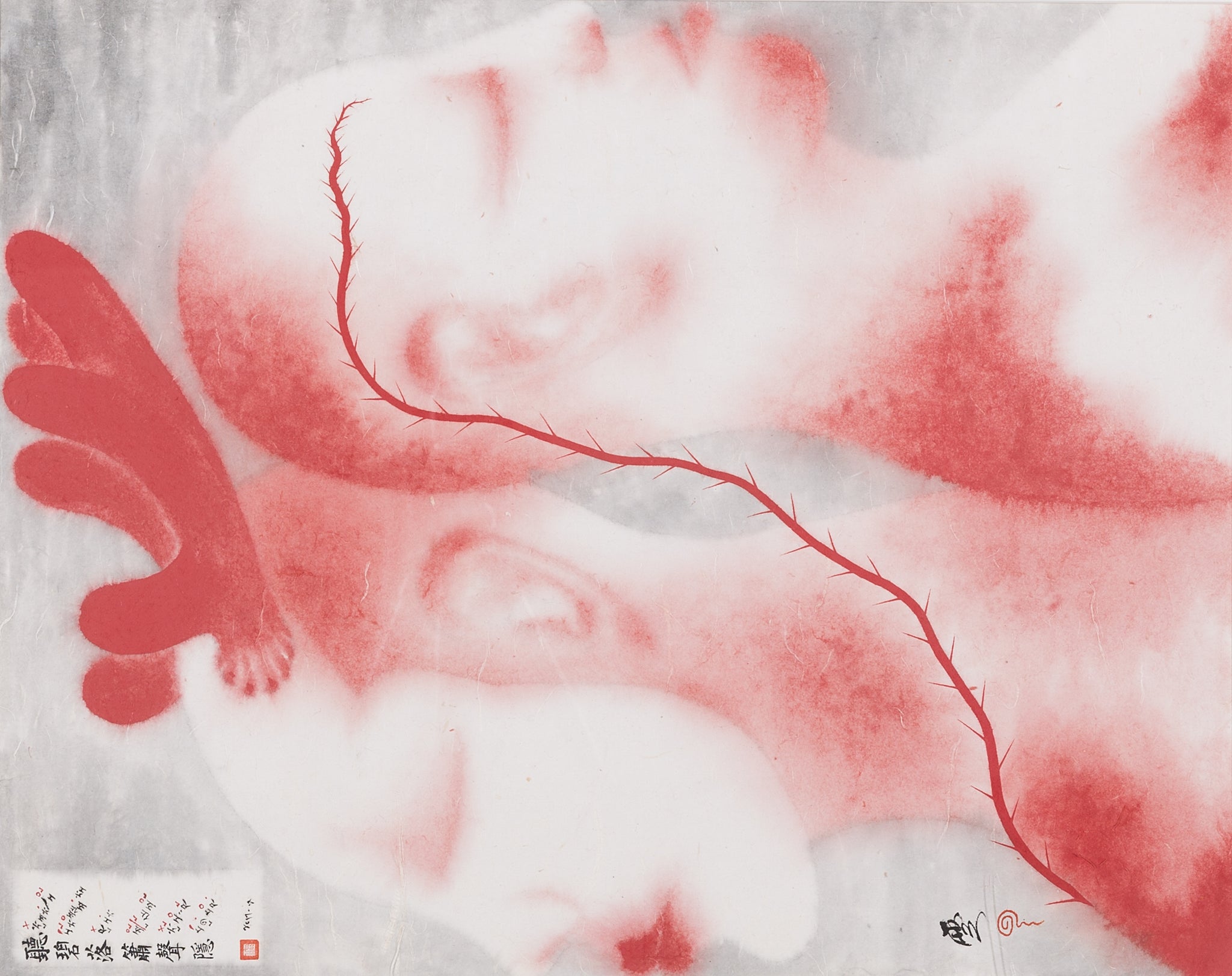 Yunyun Wang is celebrated for redefining traditional Chinese ink aesthetics through a contemporary lens. Her approach merges gongbi precision with expressive abstraction, often highlighting delicate genderless bodies, surreal motifs, and psychologically charged space. The red hues here, carefully diffused through xuan paper, convey both emotional warmth and latent tension. This work speaks to broader themes of mutual dependence and invisible bonds—recurring ideas in her oeuvre. Wang’s stylistic DNA draws influence from classical Chinese literati painting and contemporary East Asian minimalism, while being distinctly her own.
