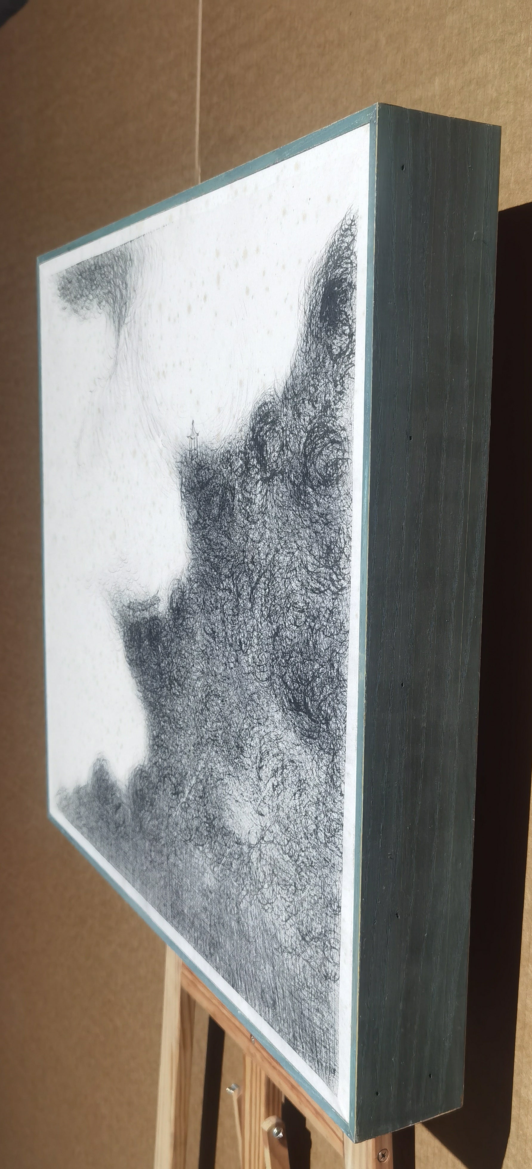 Untitled no.3 by Guangwang Liu is a lyrical Chinese painting measuring 53 by 47.5 centimeters. The work depicts a solitary pavilion delicately suspended within a field of soft, shadowy brushstrokes that flow across the surface like drifting mist. At its center, a glowing area of white space acts as both compositional anchor and void, imbuing the painting with a serene, contemplative presence.
