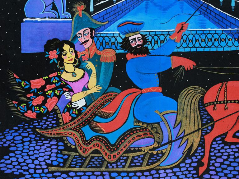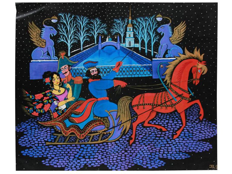 The artwork by Julia Mikhailovna Belomlinskaya transports viewers into a captivating fairytale scene. In the foreground, a horse-drawn sleigh takes center stage with a couple riding within it. The backdrop unfolds into a lavish architectural setting featuring two figures standing on a bridge and, to the right, a grandiose building in the distance. The predominantly black and brilliant blue color scheme sets the mood, with the most striking chromatic contrast occurring in the foreground. Here, the vivid red of the horse and the red elements of the figures' garments and sleigh details create an eye-catching focal point.