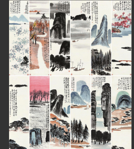 This expansive suite comprises twelve vertical scroll paintings, executed in the style of the celebrated modern Chinese painter Qi Baishi (1864–1957). Each scroll features a distinct landscape composition paired with poetic calligraphy, creating a contemplative rhythm across changing natural scenes. The works together form a panoramic journey through mountains, forests, rivers, and architectural motifs.