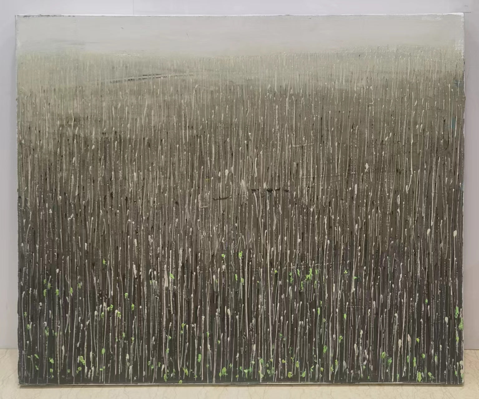 New Buds of Withered Reed Dew Near the Lake (2016) is an evocative oil painting by Wei Luning, capturing a vertical field of slender reeds pushing upward toward a hazy, tonal horizon. The composition is structured through rhythmic, textured strokes of pale white and green pigment, suggesting new growth emerging from decay. With its rich layering and textural depth, the work suggests both the fragility and resilience of life in nature—rendered with a lyrical abstraction that transcends direct representation.