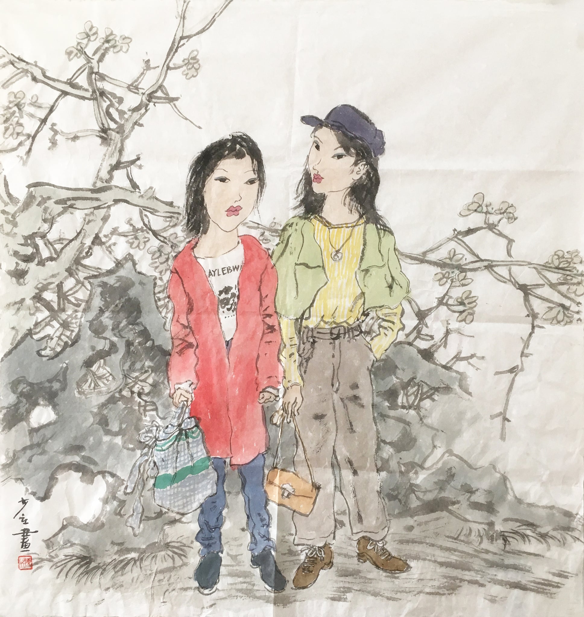 Girl 2 is an engaging ink and watercolor composition by Chinese artist Shaoli Chen, portraying two young women standing amidst a garden landscape with blossoming branches and ornamental rocks. The figures are stylishly dressed, depicted with expressive features and vibrant colors that lend the work a contemporary charm.