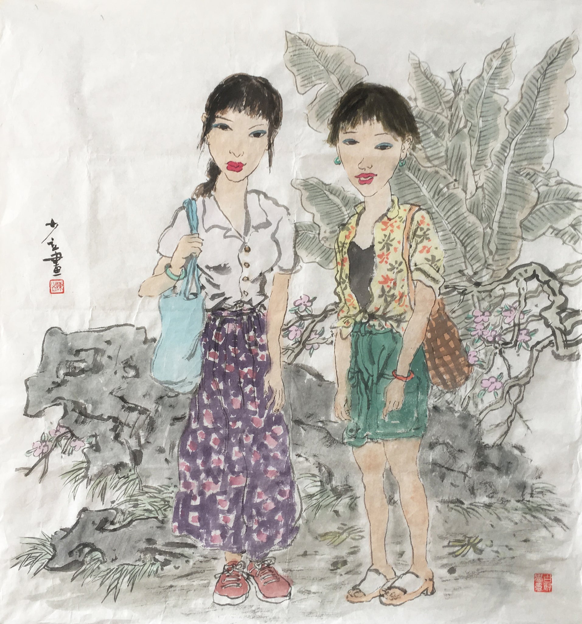 Plantain Girl is a captivating ink and watercolor composition by celebrated Chinese artist Shaoli Chen. This work depicts two young women standing amid a traditional garden setting, framed by elegantly rendered banana leaves and ornamental rocks. The figures are distinguished by their vibrant modern attire—one in a floral blouse and green shorts, the other in a patterned skirt and white blouse—imbuing the composition with a sense of casual charm and youthful vitality. Chen’s controlled brushwork and soft color palette evoke a harmonious balance between figuration and landscape.