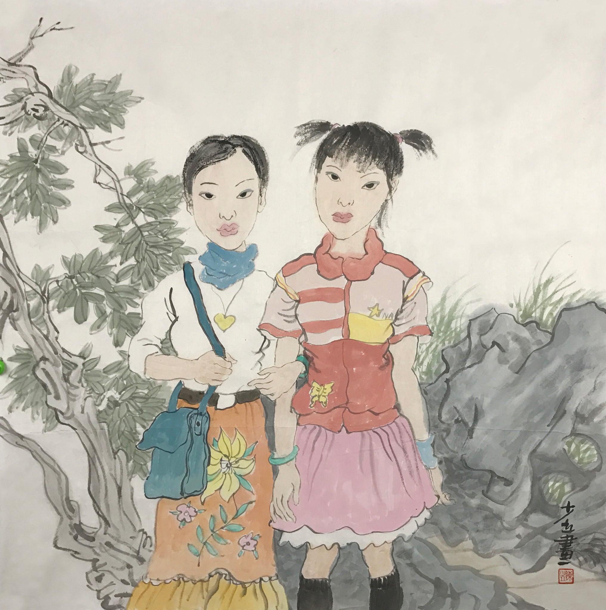 Blending the refined techniques of traditional Chinese ink painting with playful modern stylization, Chen captures youthful innocence through expressive outlines and delicate washes of color. The attention to accessories—heart-shaped pendants, floral embroidery, and layered skirts—introduces a whimsical yet detailed fashion sensibility that reflects his contemporary aesthetic.