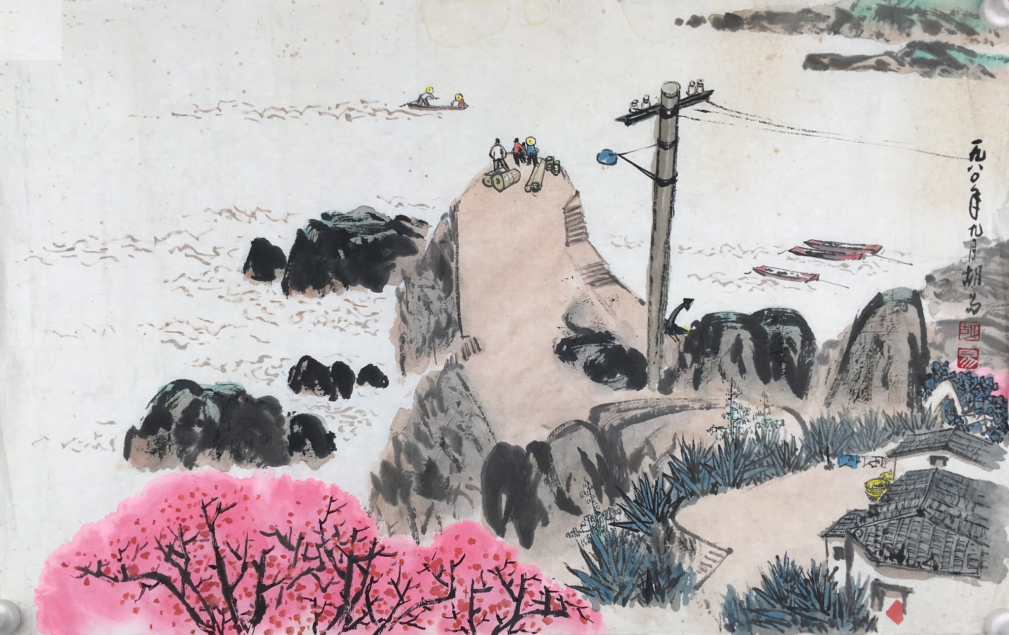 Peach Blossom Fragrance is a charming landscape by Hu Yi, created in ink and watercolor on paper. The composition captures a coastal scene where rocky cliffs meet gentle waves, dotted with human activity—figures strolling along the ridge, boats drifting on the water, and a small structure nestled amid spring foliage. At the lower left, a radiant blooming peach tree anchors the foreground in vibrant pink, adding both color contrast and symbolic resonance. The inclusion of modern elements, such as a utility pole, subtly bridges past and present.