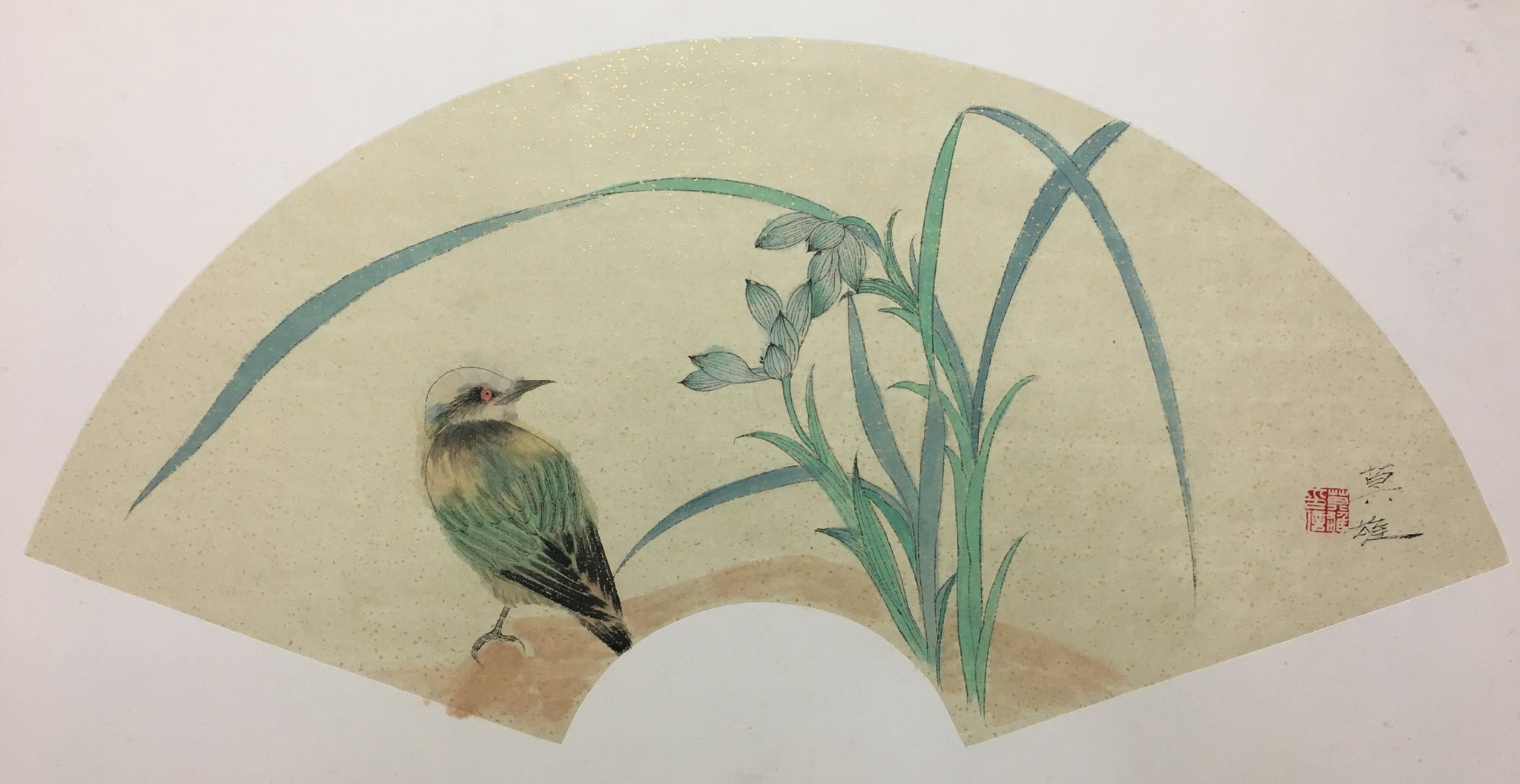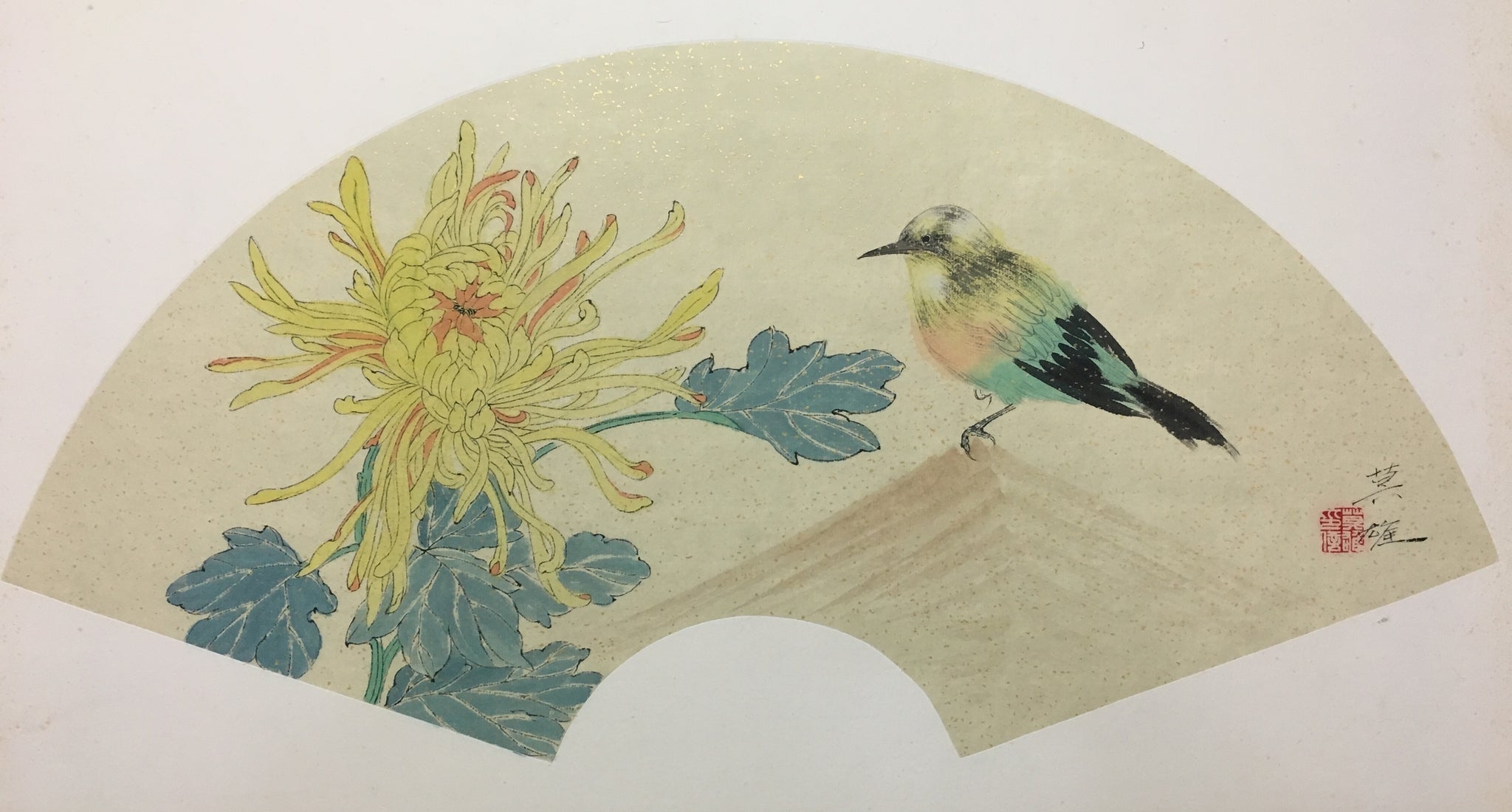 This refined set of four fan-shaped paintings by Mo Xiong, Title:d Bamboo, Chrysanthemum, Orchid, and Plum Blossom, presents a delicate tableau of traditional Chinese botanic motifs paired with birds in seasonal landscapes. Executed in ink and color on paper, each fan measures 68 x 34 cm and showcases the artist’s lyrical brushwork, subtle coloration, and adherence to classical compositional elegance. The works are painted on shimmering speckled paper, heightening the sense of refined craftsmanship and cultural reverence.