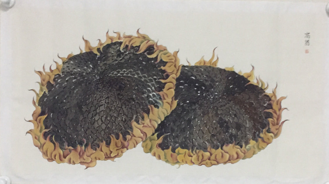 This striking ink and watercolor work by Gao Xiang features two mature sunflower heads rendered with remarkable precision and rich tonality. The layered, textural seeds and curling petals evoke both botanical realism and symbolic decay, capturing a powerful stillness.