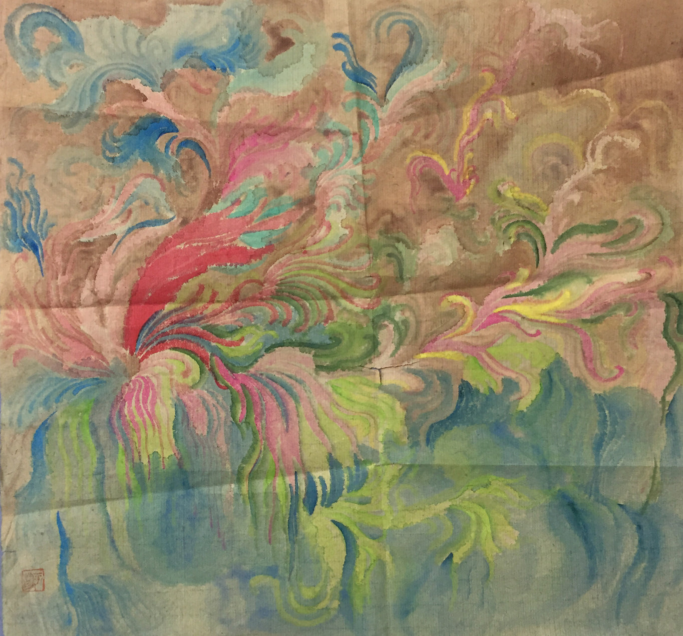 The work exhibits pronounced creases, likely from past folding during storage, and includes a small tear in the central portion of the paper. Despite these imperfections, the overall structure of the composition remains intact, and the colors retain their vibrancy. Conservation treatment could be considered to address the tear and improve presentation, though the artwork maintains compelling aesthetic integrity as-is.
