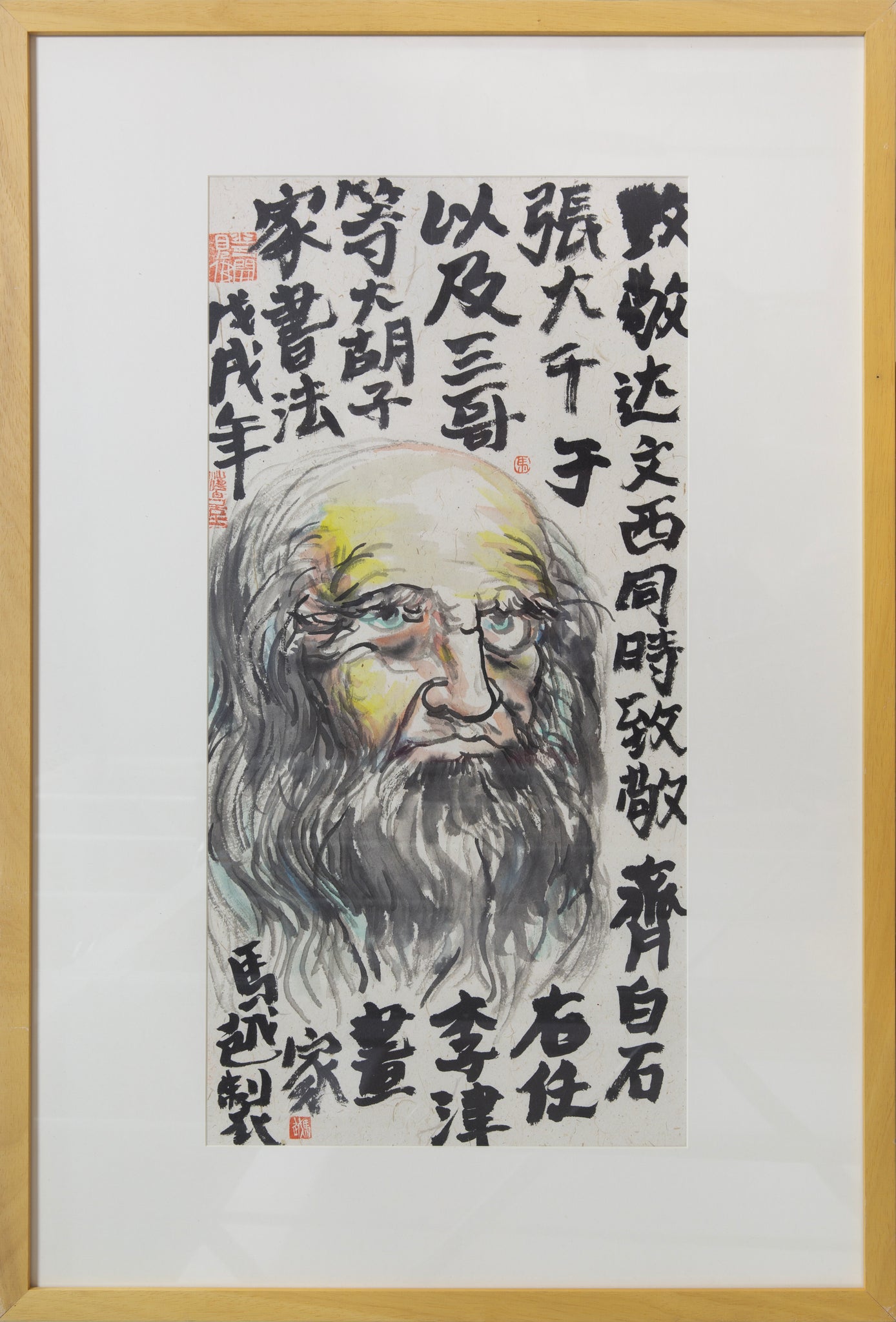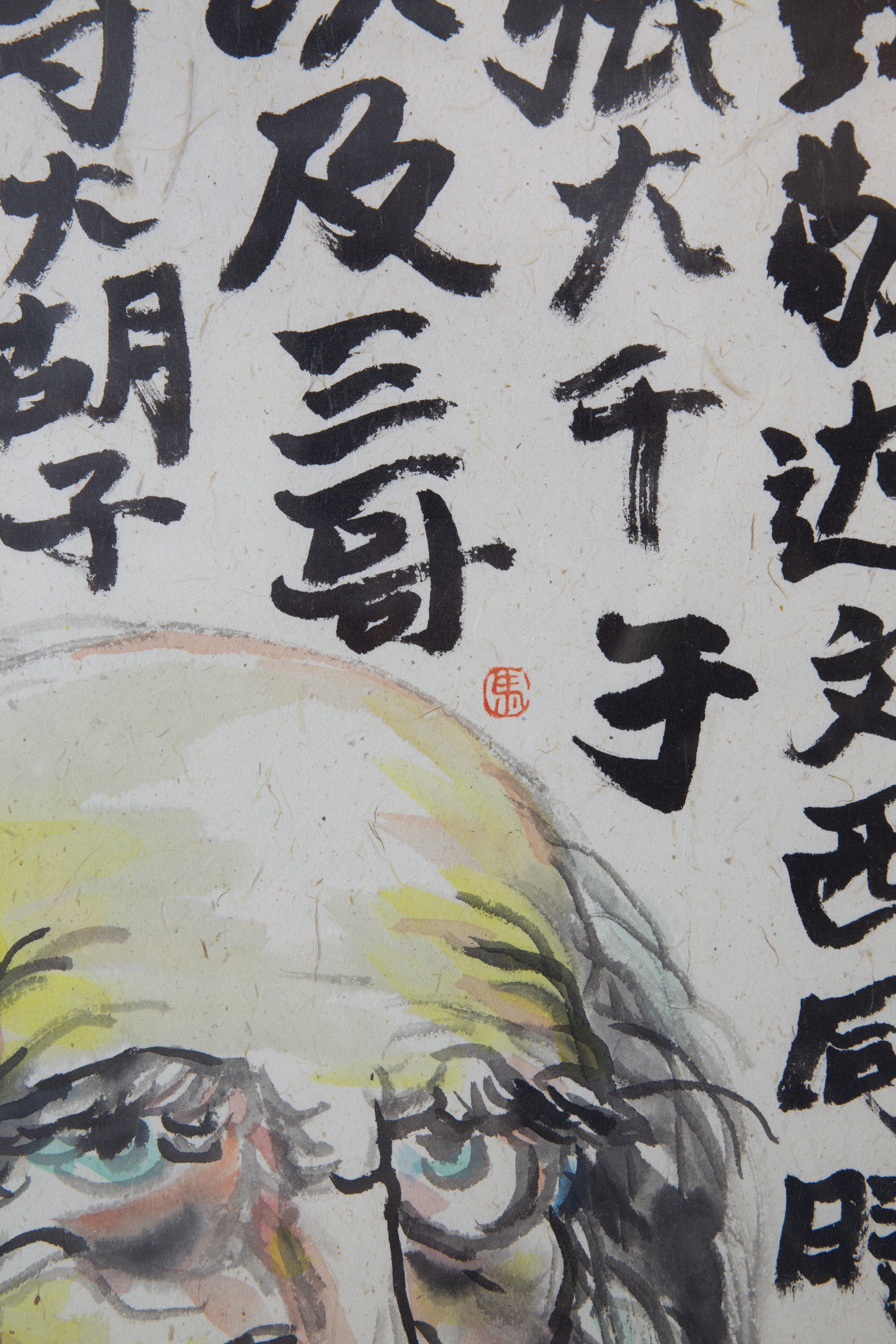 Ma Yue skillfully merges traditional Chinese ink techniques with Western portraiture. The vivid brushstrokes and dynamic color washes evoke the energy of expressionist watercolor, while the surrounding calligraphy, composed in a powerful xingshu (semi-cursive) style, situates the work within the tradition of Chinese scholar-artist painting. This cross-cultural homage demonstrates both reverence and reinterpretation, bridging two historically rich artistic legacies.