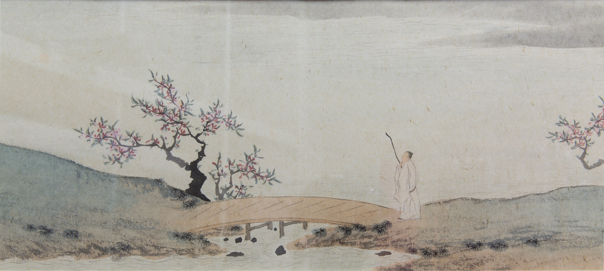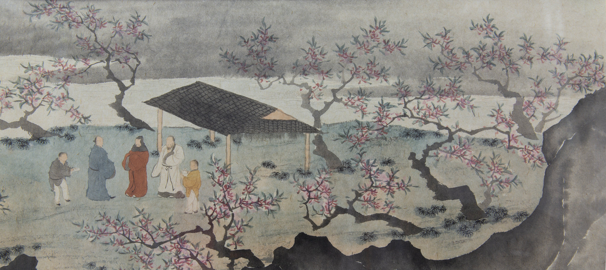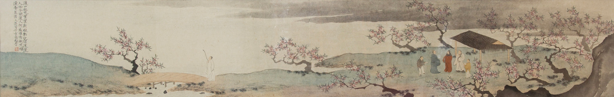 Peach Blossom Crossing is a panoramic horizontal ink and color composition by contemporary artist Chen Chaoqun, measuring 23 x 139 cm. Executed on paper, the painting presents a lyrical landscape dotted with blossoming peach trees, through which several robed figures stroll in quiet contemplation. The scene unfolds along a gentle riverside path, flanked by delicate rock formations and a modest pavilion nestled among the blossoms—evoking a tranquil atmosphere rich with poetic allusion.