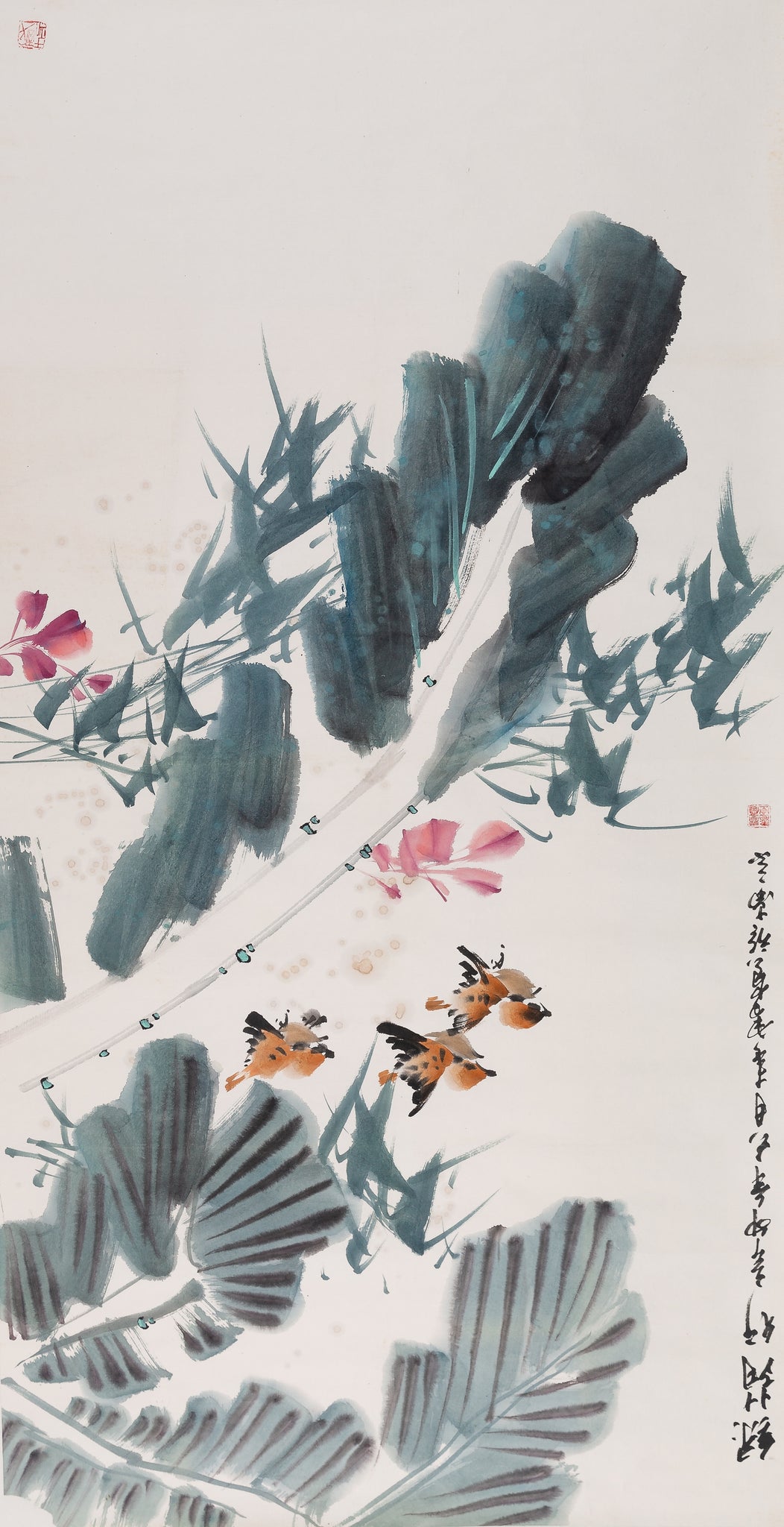 In this large vertical composition, Chun Lei presents a vibrant natural scene featuring pink blossoms, broad banana leaves, and two delicately painted birds in mid-flight. The artist’s masterful brushwork merges soft ink washes with crisp, colorful detail, creating a graceful balance of movement and stillness.