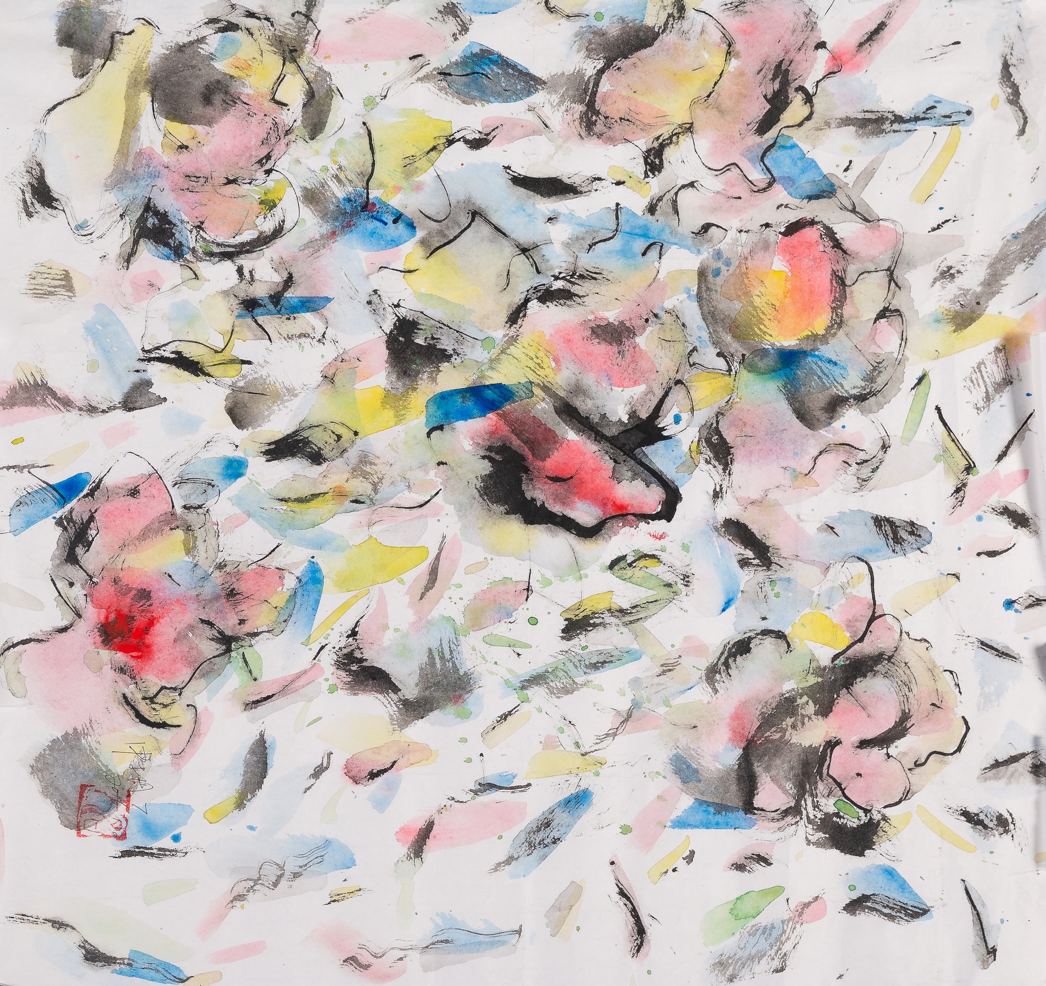 You Ming's work bridges the boundary between classical Chinese ink traditions and modern abstract expression. Employing freehand (xieyi) brush techniques alongside bold chromatic accents, the artist draws influence from both postwar Western abstraction and the New Ink Painting movement of the late 20th century. The interplay of linear marks and washes recalls the visual spontaneity of Zhang Daqian’s late splashed-ink works while embracing a youthful palette and loose composition.