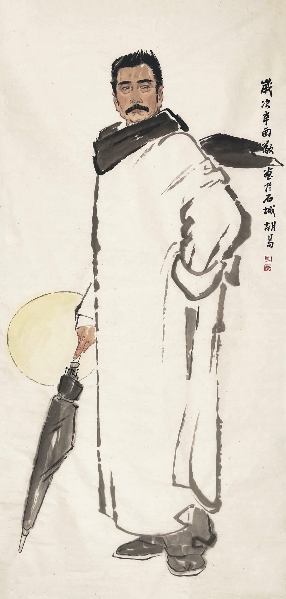 This striking full-length portrait by Hu Yi depicts Lu Xun (1881–1936), one of China’s most revered literary figures and social critics. The subject stands tall, clad in a traditional robe with a scarf draped over his shoulders and an umbrella in hand. The minimalist composition emphasizes the figure’s contemplative dignity and quiet strength, painted with bold yet restrained brushwork in ink and light color.