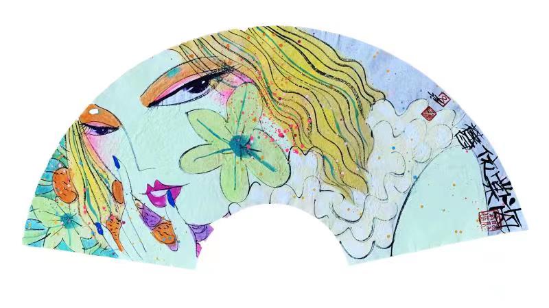 Lv Jiang’s fan paintings continue to blend the tradition of Chinese literati formats with the aesthetics of contemporary pop surrealism and feminine portraiture. The facial features and ornate styling evoke the refinement of Peking Opera figures, filtered through a distinctly modern lens. The floral motifs—particularly the begonia over the cheek—serve both as botanical detail and as symbolic mask, merging identity and ornamentation.