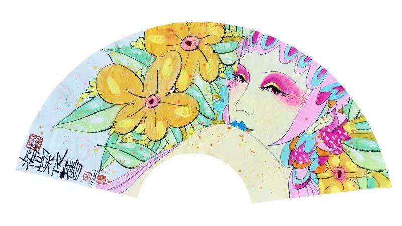 This work exemplifies Lv Jiang’s distinctive fusion of classical Chinese brushwork and contemporary pop portraiture. Using the traditional fan format as a base, he infuses the subject with the flair of Peking Opera aesthetics—seen in the elaborate headpiece, arched eyebrows, and theatrical cosmetics. The loose, expressive watercolor technique and speckled pigment application lend the piece a dreamlike and ornamental quality.
