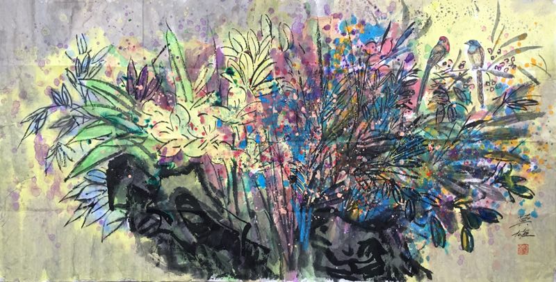 This vibrant horizontal composition Title:d Vase by Mo Xiong unfolds like a blooming tapestry. Lush vegetation and sprays of color burst outward from a central, unseen vessel, revealing lively florals and birds amidst abstract, energetic ink lines. The bouquet swells across the paper with a rhythmic interplay of density and openness, anchored by loosely defined rock forms that ground the otherwise ethereal structure.